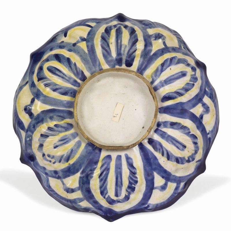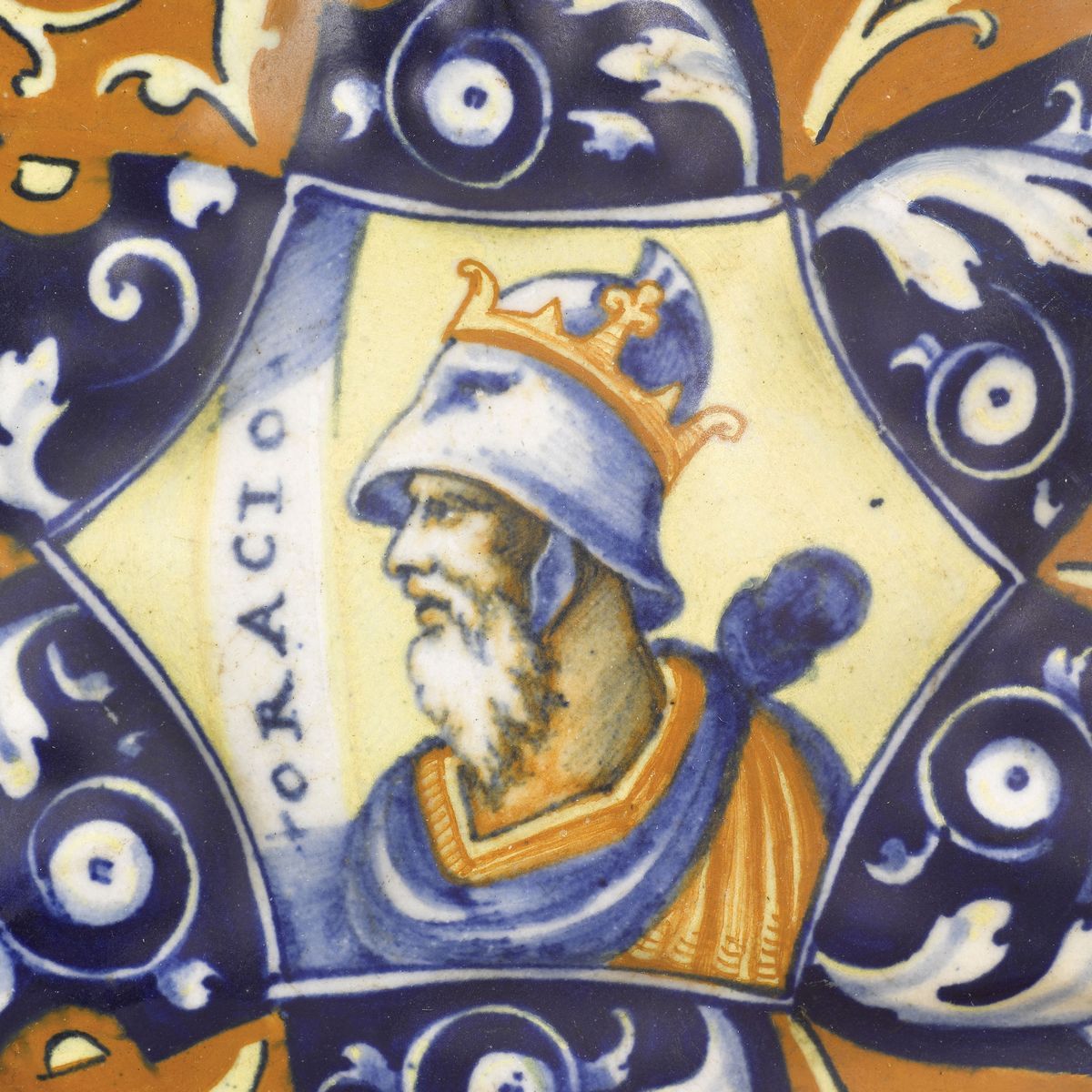 La coppa mostra ampia parete, poggiante su basso piede svasato, con ampie baccellature ovali (“crespina”), disposte attorno ad un umbone esagonale, ad orlo ondulato scandito da sei piccole punte. Al centro dell’umbone campeggia il busto vòlto a sinistra di un personaggio barbato, che indossa un elmo coronato e clamide, associato ad un cartiglio verticale con la scritta “ORACIO”, tracciata in caratteri capitali. Sulla restante superficie si dispone una decorazione “a quartieri”, con zone a fondo arancio, sia a losanga sia cuoriformi, che includono tralci fogliati, girali e foglie di acanto. Sul verso l’opera è dipinta con un motivo a corolla composto di petali a larga profilatura blu. Dipinta in arancio, blu, bruno, giallo e verde. La foggia corrisponde alla tipica “crespina”, ispirata ai metalli sbalzati ed ai vetri, che tanta fortuna avrà anche nella fortunata stagione dei “bianchi” di Faenza, nella quale proseguirà senza variazioni morfologiche di rilevo per alcuni decenni, specie nel corso della seconda metà del ‘500. Da un punto di vista decorativo siamo di fronte ad un pregevole esempio di coppa “a quartieri”, in cui il gioco geometrico delle scansioni qui si presenta piuttosto originale, alternando rombi a formelle cuoriformi, che racchiudono gli stessi tralci fogliati del vasellame da farmacia, simili a delle “cerquate”. La soluzione del medaglione a fondo giallo, molto luminoso, è ricorrente in questa tipologia di coppe, ed ampiamente documentabile sia in reperti provenienti da siti urbani sia in opere di raccolte pubbliche e private 1. Anche la decorazione del retro, di pronto effetto, ha molti riferimenti: si rinvia, ad esempio, a due “crespine” delle raccolte del Museo faentino 2. In quanto nome Orazio, indicato nel cartiglio, esso si presta almeno alla duplice interpretazione: che si sia voluto celebrare il grande poeta romano oppure, più verosimilmente, Orazio Coclite, leggendario cavaliere romano ed eroico difensore del ponte Sublicio. 1La stessa foggia e medaglione esalobato si riscontrano in tre “crespine”, conservate al Louvre (GIACOMOTTI 1974, schede nn. 937-939). 2RAVANELLI GUIDOTTI 1998, pp. 376-379, schede 93- 94.