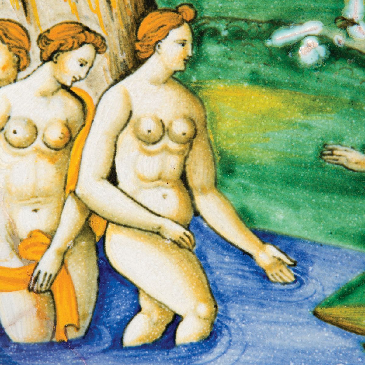 Coppa a cavetto liscio con orlo leggermente rialzato ed ampio piede svasato. A piena superficie è istoriato il mito di Atteone mutato in cervo (OVI- DIO, METAMORFOSI, III, 138- 252). In particolare è fissato il momento in cui il giovane, durante una battuta di caccia, sorprende Diana e le ninfe sue compagne, intente al bagno. La dea adirata è raffigurata sul punto di gettare acqua su Atteone, così da trasformarlo in cervo. Qui però il giovane ha ancora le sembianze di pastore e non è seguito dai cani che, dopo la metamorfosi in cervo, non riconoscendo il padrone, lo sbraneranno. Dipinto in arancio, bruno, blu, giallo, nero e verde. Questa poetica versione di Atteone fa parte nel corpus pittorico del Manara, maiolicaro faentino la cui attività, per le opere datate, ad oggi è documentata tra il 1532 e il 1538. Anche se non è datata, questa coppa è uno dei saggi più riusciti del maestro, in cui egli manifesta copiosamente e magistralmente tutti gli stilemi a lui peculiari (blocchi rocciosi a scaglie, città murate con alti edifici in lontananza, montagne all’orizzonte che sembrano cristalli di ghiaccio ecc.), cui va aggiunta una particolare qualità cromatica, fragrante di verdi e azzurri emulsionati, e di orizzonti in cui il giallo sfuma nell’azzurro in un momento indefinito di alba/tramonto. Inoltre la stessa posa aggraziata dei suoi protagonisti e la bonaria concretezza delle forme delle figurine femminili ignude (seno arrotondato col capezzolo marcato), li ritroviamo anche nei piatti datati “1534” e “1535”, con “Narciso” e con “La Resurrezione” del Victoria and Albert di Londra, e con “Tuccia” , del British Museum, con “Esaco ed Esperia” di raccolta privata, con “Atalanta e Ippomene” del Fitzwilliam Museum di Cambridge, con “Il Trionfo del tempo” dell’Ashmolean Museum di Oxford, ecc.1. Questa coppa passò all’asta londinese di Christie nel giugno 1992, come opera vicina alla maniera del “Pittore in Castel Durante”: attribuzione che seppur ormai superata, mantiene un suo interesse critico perché dà occasione di osservare come intorno al terzo decennio del ‘500 sia a Faenza sia nelle botteghe marchigiane fosse maturata una comune maniera peculiare al lessico del “primo-istoriato”, con istorie popolate di figurine dalle pose armoniose, sempre calate in un’atmosfera che la tavolozza tersa e delicata fa sembrare rarefatta e un po’ sospesa. In senso iconografico queste istorie vengono vengono elaborate di preferenza guardando sia le vignette silografate delle edizioni a stampa “volgari”, specie ovidiane, sia le incisioni raffaellesche di Marcantonio Raimondi. In questo caso il maestro per Atteone ha trascritto in controparte, ma con tutta la sua seducente vena fabulistica, la figura di Ippomene da una delle vignette dell’edizione veneziana delle “Metamorfosi” di Ovidio (b,c), impiegata integralmente anche per un istoriato col mito di “Atalanta”, del Fitzwilliam Museum di Cambridge, mentre per quella di Diana ha dedotto la stessa figura della omonima incisione del “Maestro. I. B. con l’uccello” (d, e). 1RAVANELLI GUIDOTTI 1996, pp. 112- 123, schede 2-4, 12, 23, 28, pp. 142- 144, 172-175, 188-190. Bibliografia L’opera è passata all’asta di Christie’s nel 1992 (CHRI- STIE’S 1992, lotto 282) ed è pubblicata in: RAVANELLI GUIDOTTI 1996, pp. 130-131, scheda 7.