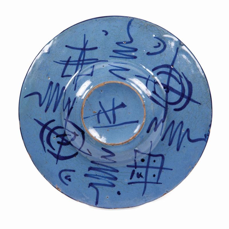 Piatto a cavetto fondo, con appoggio del piede appena segnato e a lieve incavo, e un’ampia tesa a bordo profilato (“tondino”). Al centro del cavetto campeggia un medaglione che racchiude una composizione “a trofei” musicali, con un liuto poggiante su carta da musica, sotto cui spuntano degli strumenti a fiato. Attorno, fino all’orlo, marcato da una larga filettature blu, si dipingono dei motivi “rabesche” alternati a nastri annodati (decorazione “a groppi”) e verso il bordo un festone con foglie, frutta legate da nastri. Sul verso, nel cavo del piede sono tracciati dei segni che potrebbero essere letti come le iniziali (“N” e “A”?), mentre sulla restante superficie sono tracciati tre cerchi tagliati in diagonale, alternati ad altrettanti spirali e rombi, anch’essi tagliati in diagonale. Dipinto in arancio, giallo, verde e blu su fondo azzurro “berettino”. Siamo ancora davanti ad un’opera che rientra nelle cosiddette “vaghezze e gentilezze di Faenza”, proposte su smalto azzurro “berettino”, categoria che rappresenta, più che la conquista di un traguardo tecnologico, peraltro in possesso di altre aree italiane (Venezia, Marche, Liguria,Toscana, ecc.), una riuscita proposta commerciale, che seppe conquistarsi un buon mercato peninsulare per l’alto grado qualitativo e la veste cromatica abbinata ad un repertorio in cui sui vasellami venivano dipinti in perfetto equilibrio distruibutivo “rabesche”, festoni, “trofei”, “grottesche”, mazzetti di frutta, ecc. Notevole in questo caso è la qualità decorativa del “trofeo”, in cui domina la bella citazione, tratta dalla realtà del tempo, di un liuto, fulcro dell’opera. Tra le molte versioni affini a questa fortunata classe di maioliche faentine, vanno ricordati nelle raccolte del Museo di Faenza, un piatto datato “1534”, un altro simile in raccolta privata faentina, datato “1539”, ed un terzo appartenuto, oltre cent’anni fa, alla raccolta di Federico Argnani (c), cui s’aggiunga una gran quantità di frammenti, recuperati da scavi urbani1. Segnaliamo inoltre piatti del tutto analoghi passati sul collezione privata2, ed altri nelle raccolte del Victoria and Albert Museum di Londra3, del Danish Museum di Copenhagen4, della raccolta della Cassa di Risparmio di Perugiav, del Museo del Castello di Milano6, del Petit Palais di Parigi7, del Museo della Senna Inferiore 8. 1 RAVANELLI GUIDOTTI 1998, pp. 306- 327. 2DRUOT 1906, n. 20; CHRISTIE’S 1998, lotto 192, coll. Hakky-Bey; collezione Serra: CATALOGO SERRA 1964, n. 123; GALEAZZI- VALENTINI 1975, pp. 58-59; PAN- DOLFINI 2015, scheda 16. 3 SANI 2010, p.56, scheda n. 12. 4HOUKJAER 2005, p. 143, scheda 129. 5WILSON- SANI 2006, pp. 72-73, scheda 23. 6RAVANELLI GUIDOTTI 2000, scheda 131, pp. 133- 134: affine, sì, ma su fondo smaltato bianco. 7BARBE 2006, scheda 62, pp.137- 138. 8ALLINNE 1928, fig. 39.