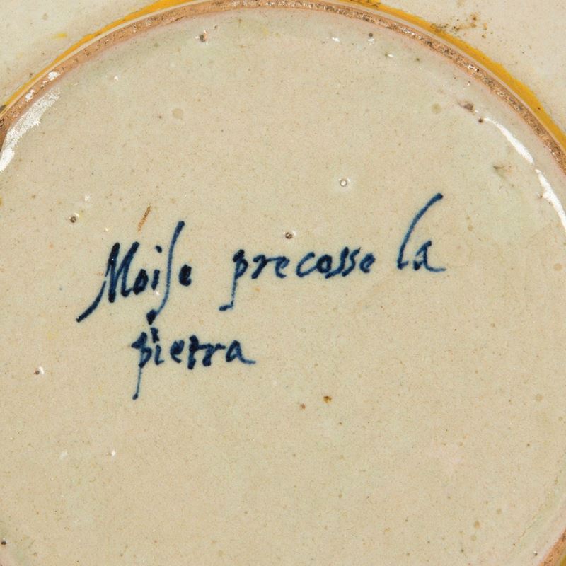Piatto a cavetto di medio diametro, ampia tesa piatta e basso piede ad anello. Sul recto, a piena superficie, è raffigurato il biblico episodio di “Mosè che batte la rupe” (ESODO 17, 7- 11; NUMERI 20, 1-13), con il vecchio patriarca raffigurato al centro, in secondo piano, in atto di battere la roccia con una verga, dalla quale con un fascio di lunghe pennellata azzurre il pittore-maiolicaro ha voluto evocare l’acqua che sgorgando poté dissetare gli armenti e il popolo d’Israele, qui rappresentato da figure maschili e femminili con fanciulli, che si affrettano ad accorrere con vasi e ciotole (a). Sul verso, al centro del piede è tracciata, in blu e in corsivo, la legenda “Moise precasse la/ pietra” (b). L’opera è un canonico saggio di istoriato urbinate del terzo quarto del ‘500, riconducibile per la qualità cromatico-stilistica alla bottega dei Fontana, specie degli anni dopo la metà del secolo, nel momento più fecondo quando cioè la produzione istoriata ormai ha raggiunto un grande virtuosismo, in cui costante è l’equilibrio delle masse figurative, così le masse arboree, il senso cromatico di bella brillantezza, valore assente nel modello incisorio, ecc. : aspetti che concorrono alla vena narrativa di attraente vivacità. Secondo la prassi più in uso nelle botteghe del tempo, il pittore ha trascritto in modo piuttosto fedele una delle vignette silografiche contenute nella Bibbia di Lione del 1566 (ESODO, Caput XV, p. 63), omettendo solo due personaggi sulla destra e due gruppi di figure che si allontanano sullo sfondo (c).