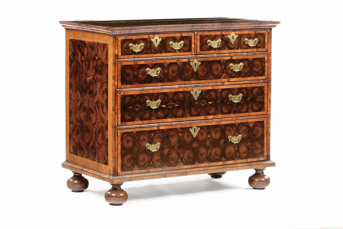 Cassettone interamente lastronato in radica e filettato, Inghilterra, inizio del XVIII secolo