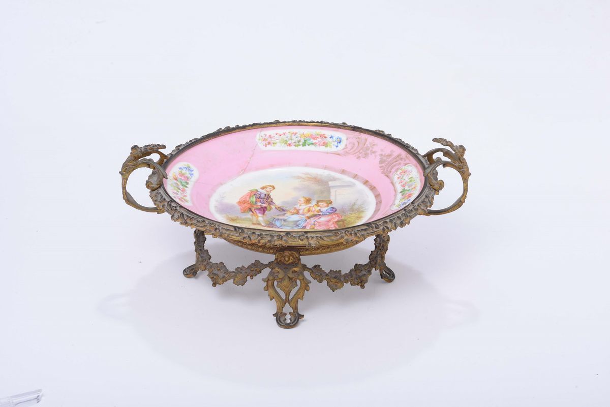 Centrotavola in bronzo dorato e porcellana, inizio XX secolo