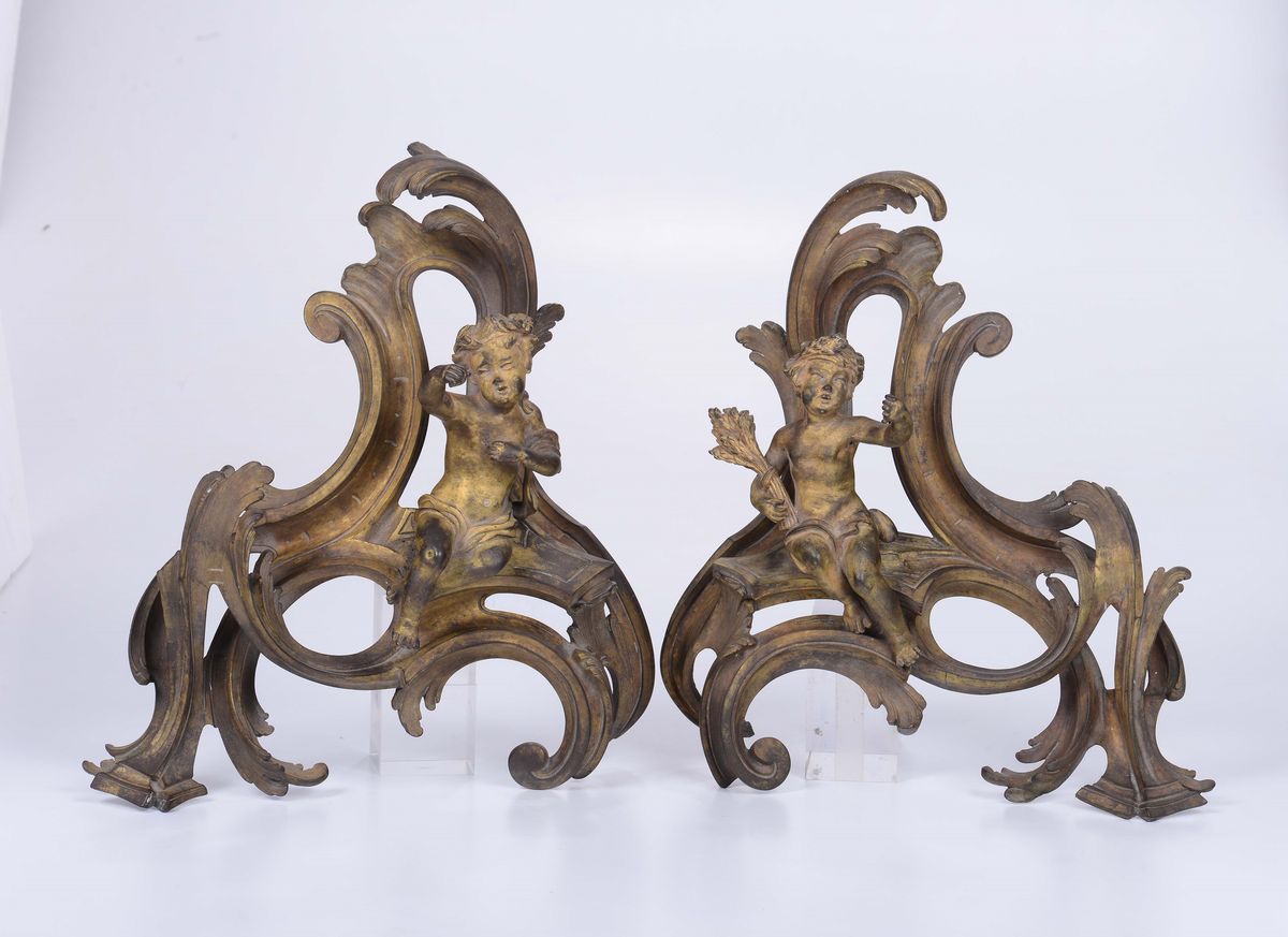 Coppia di alari in bronzo dorato, Francia, XIX secolo
