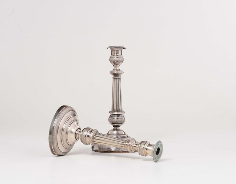 Coppia di candelieri in argento, punzoni mauriziani della metà del XIX secolo