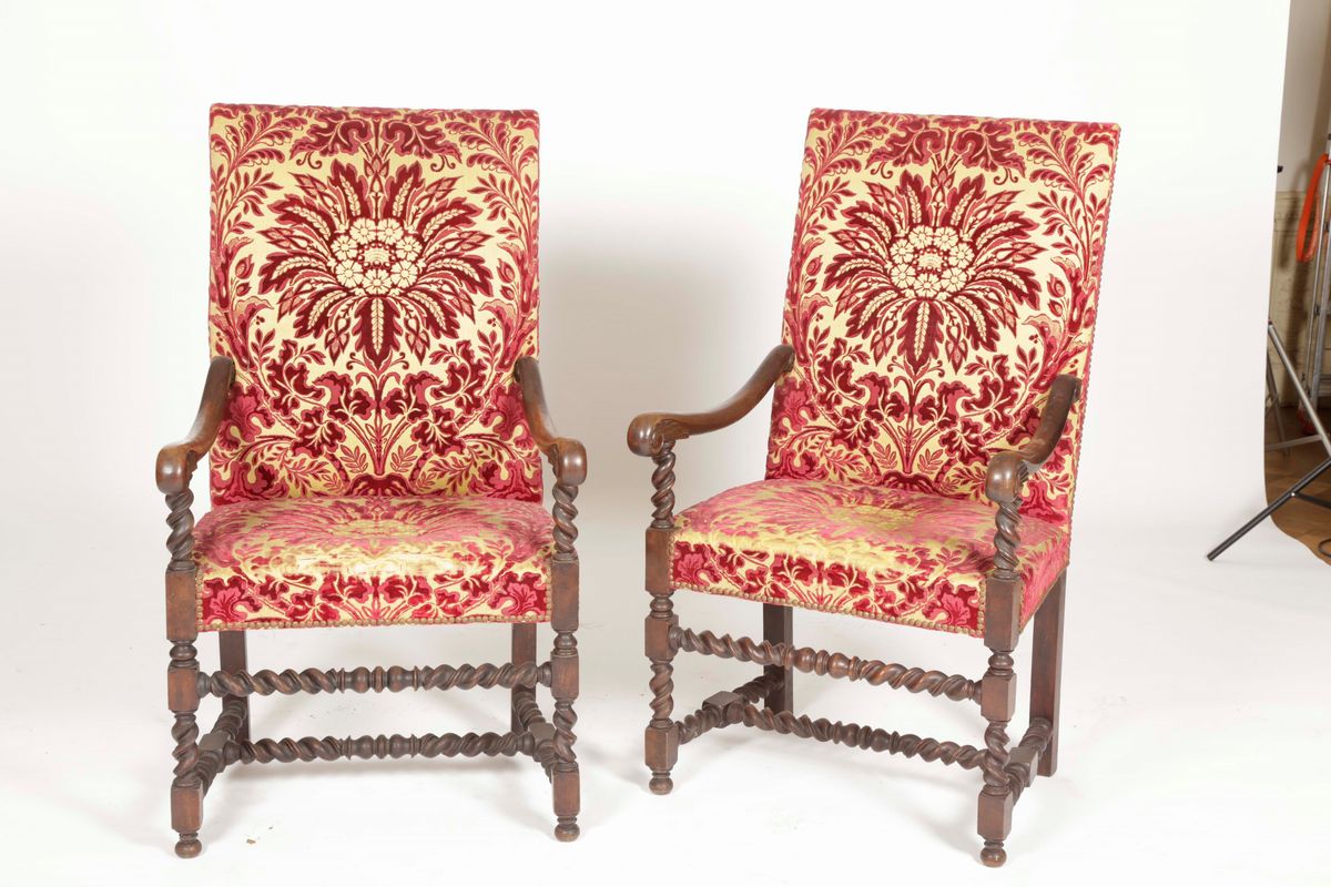 Coppia di poltrone in noce rivestite in tessuto damascato, XIX secolo