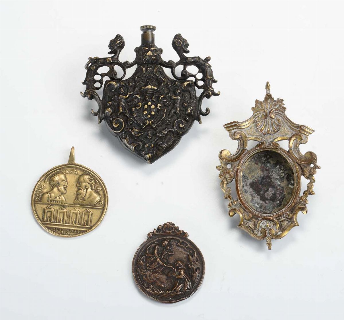 composto da piccola placca in metallo con decoro di 2 busti di Santi, Madonna e Gesù, cm 5, medaglia con scene sacre, diametro cm 4,5, contenitore in metallo con decorazioni europee e stemma, cm 9x9 e piccola cornice ovale con decorazioni europee, cm 11x6,5