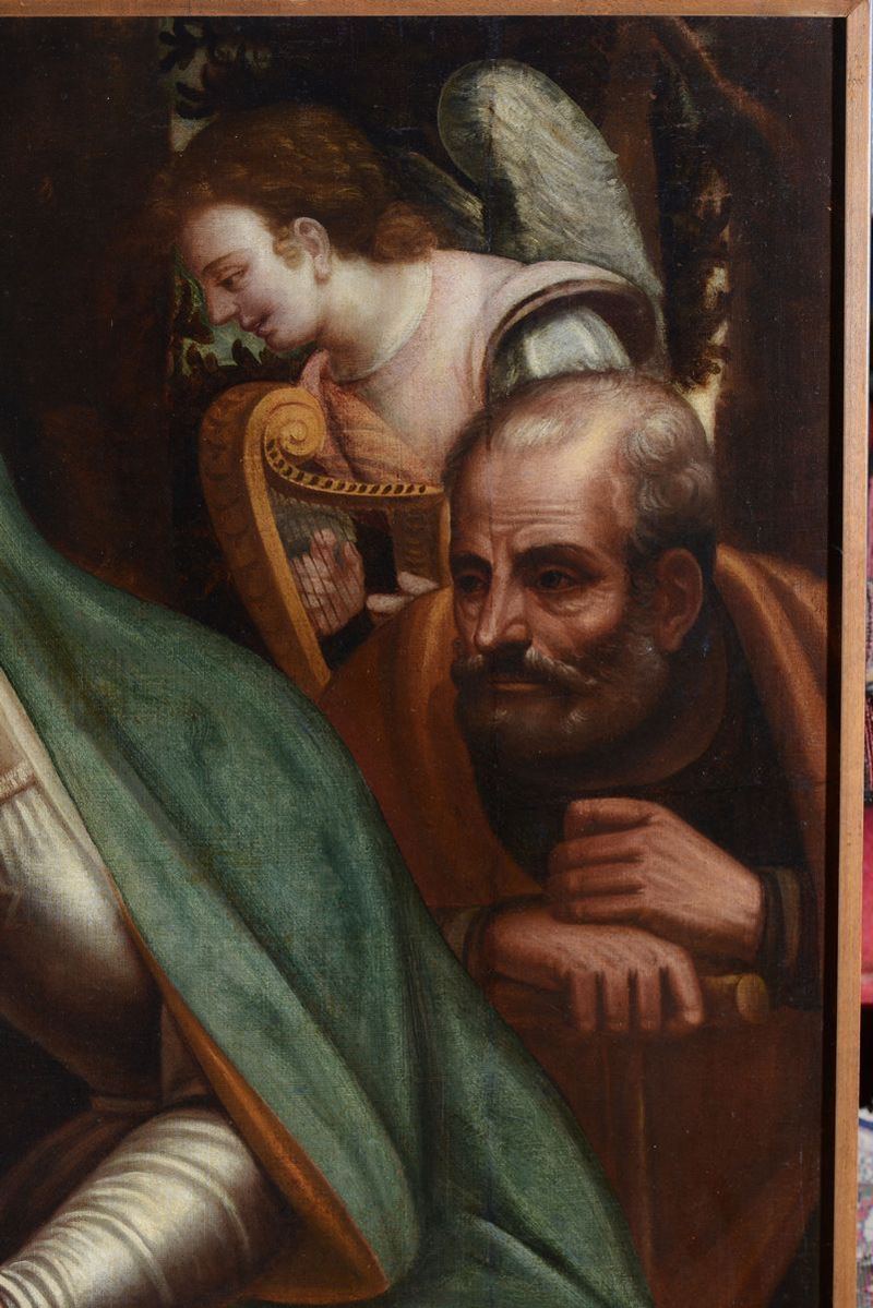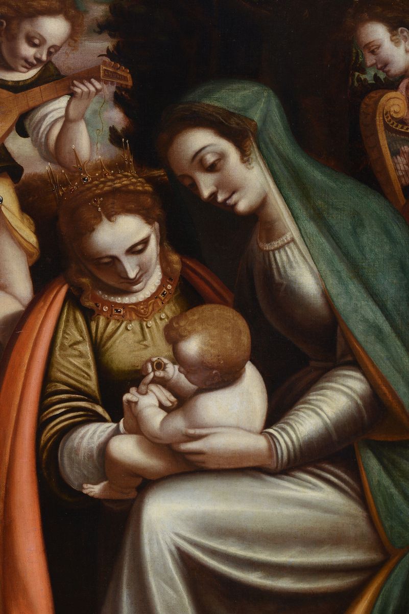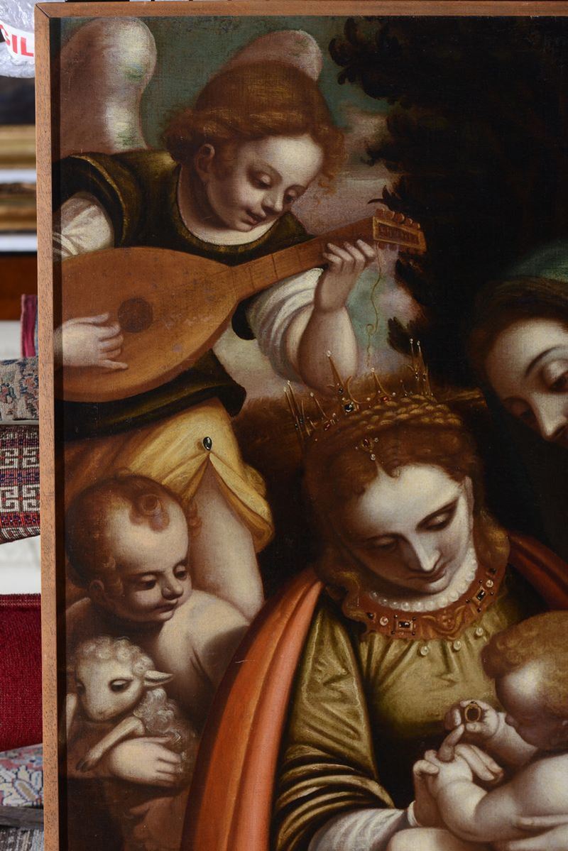 Luca Cambiaso (Moneglia 1527 - Madrid El Escorial 1585), bottega di Sacra Famiglia con Santa Caterina e angeli musicanti