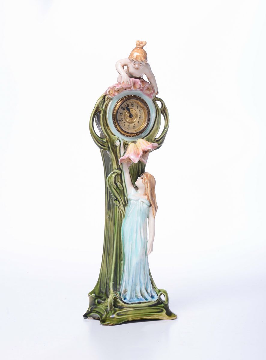 Orologio da tavolo in ceramica dipinta in policromia, primo quarto del XX secolo