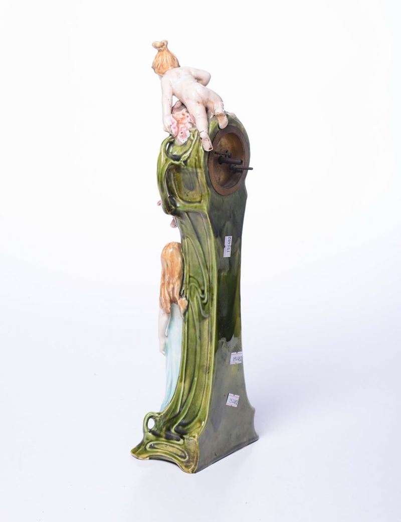 modellato con figura di giovinetta con fiori e puttino sopra la cassa decorata con motivi vegetali, quadrante con cifre romane, cm 13x9x43, inciso sotto con il numero 6563