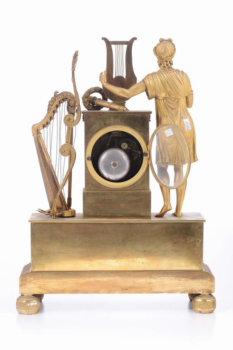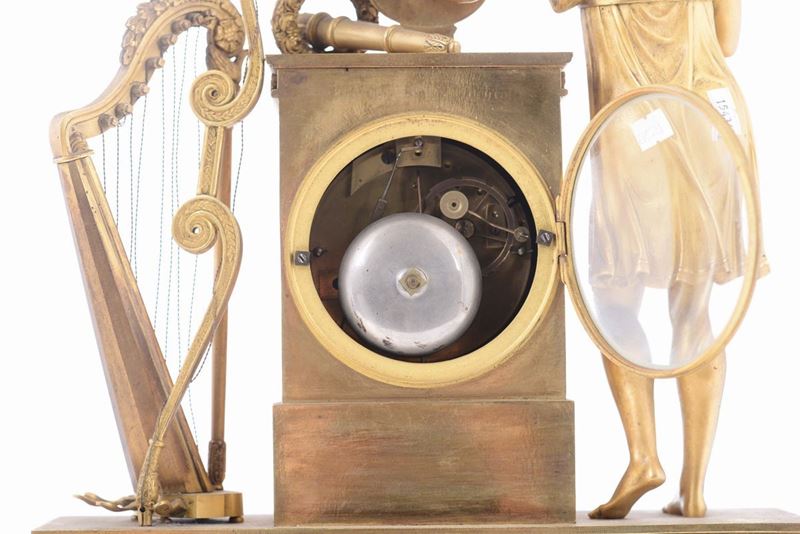 quadrante smaltato con numerazione romana in nero affiancato da figura maschile con lira e arpa, cm 37x14x52