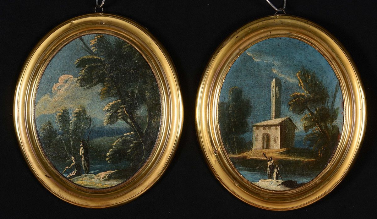 Scuola del XVIII secolo Coppia di paesaggi con figure in riva al fiume