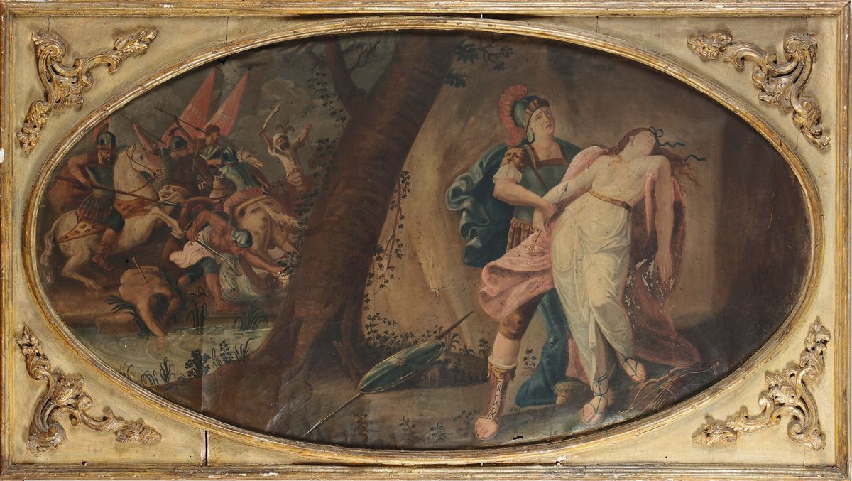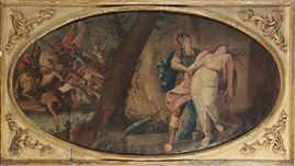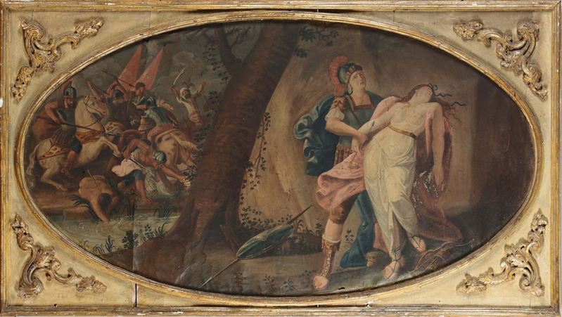 due dipinti sovrapporta ad olio su tela, cm 70x130