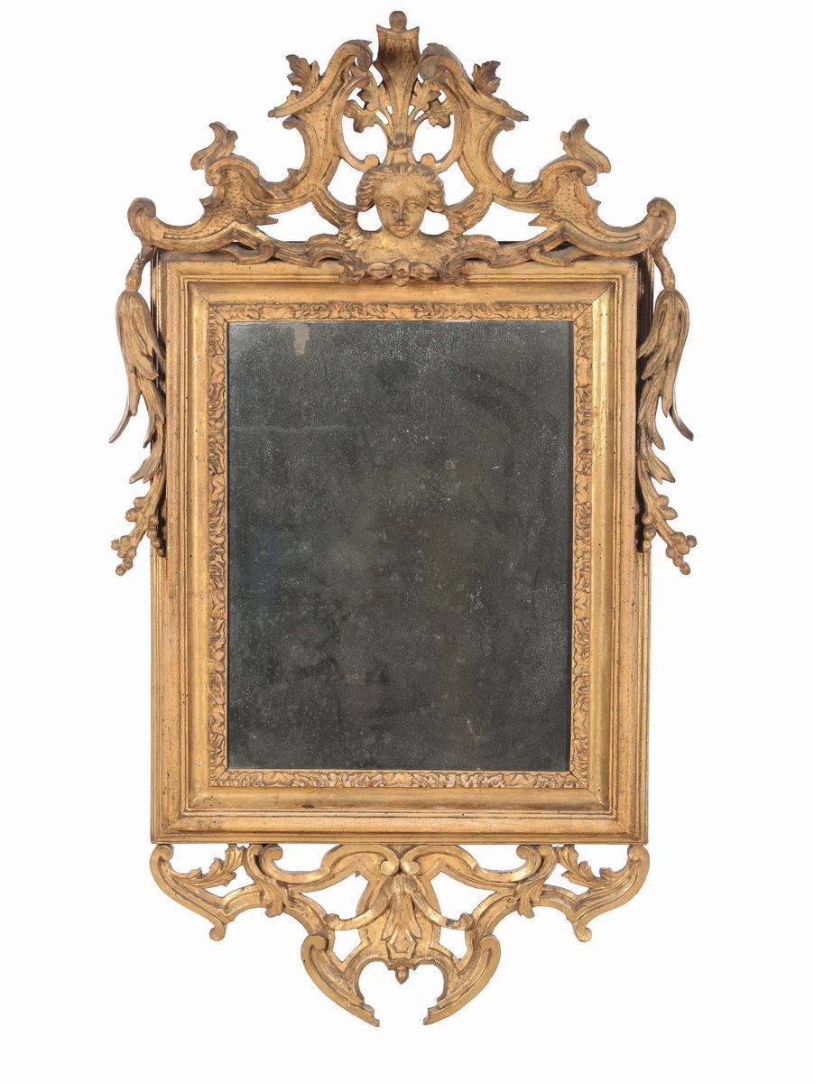 Specchiera Luigi XIV in legno dorato a mecca, Roma XVII-XVIII secolo