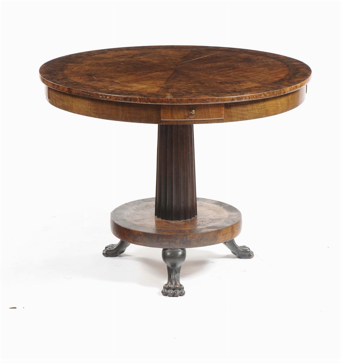 Tavolo circolare con piano lastronato in radica, XIX secolo