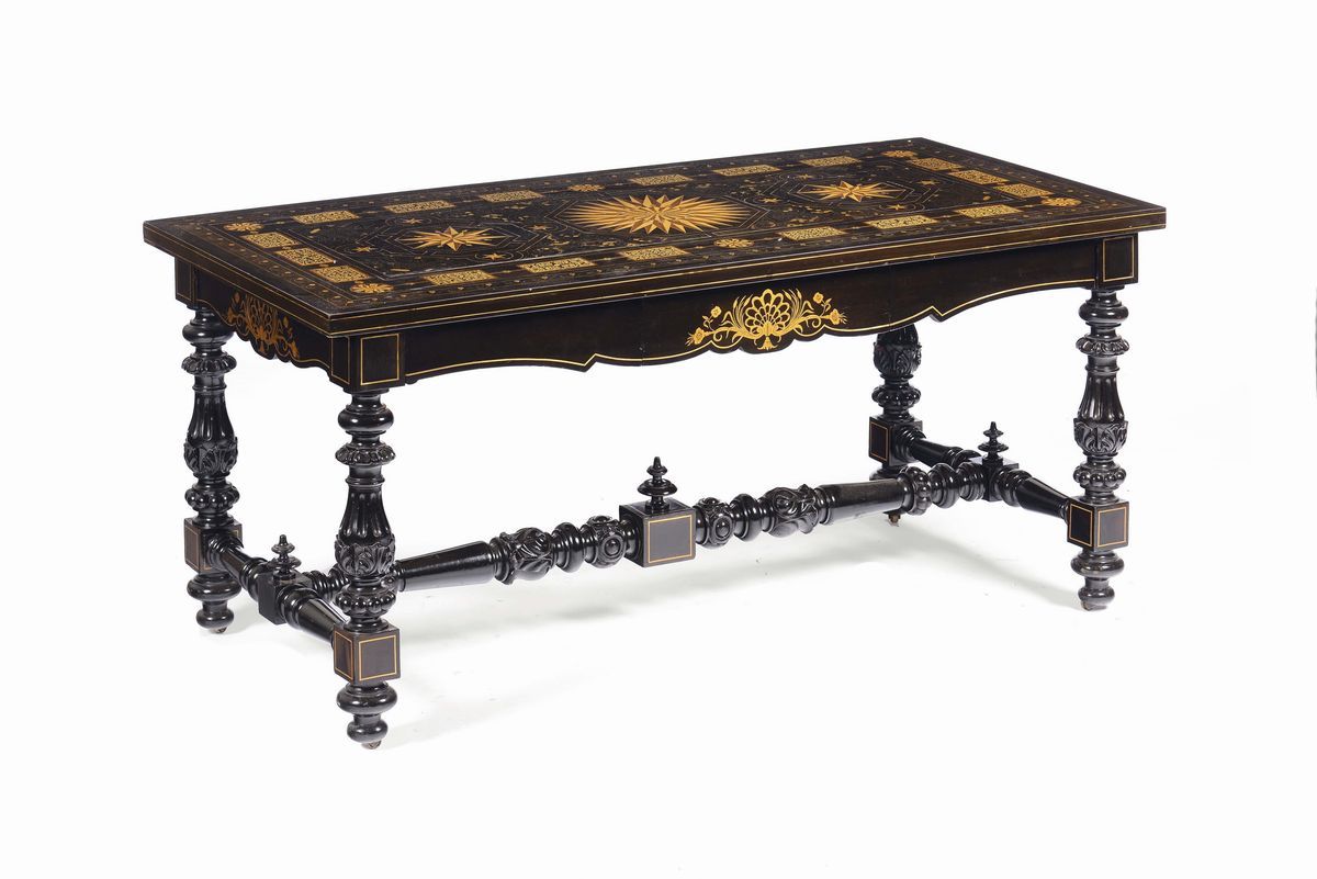 piano finemente decorato da intarsi geometrici in avorio ed essenze pregiate, montanti a balaustro riuniti da traverse tornite, cm 169x84x78