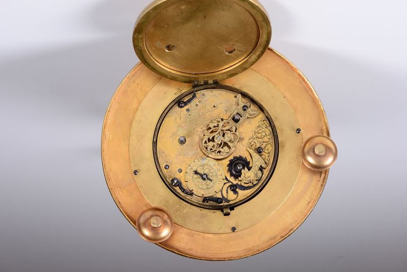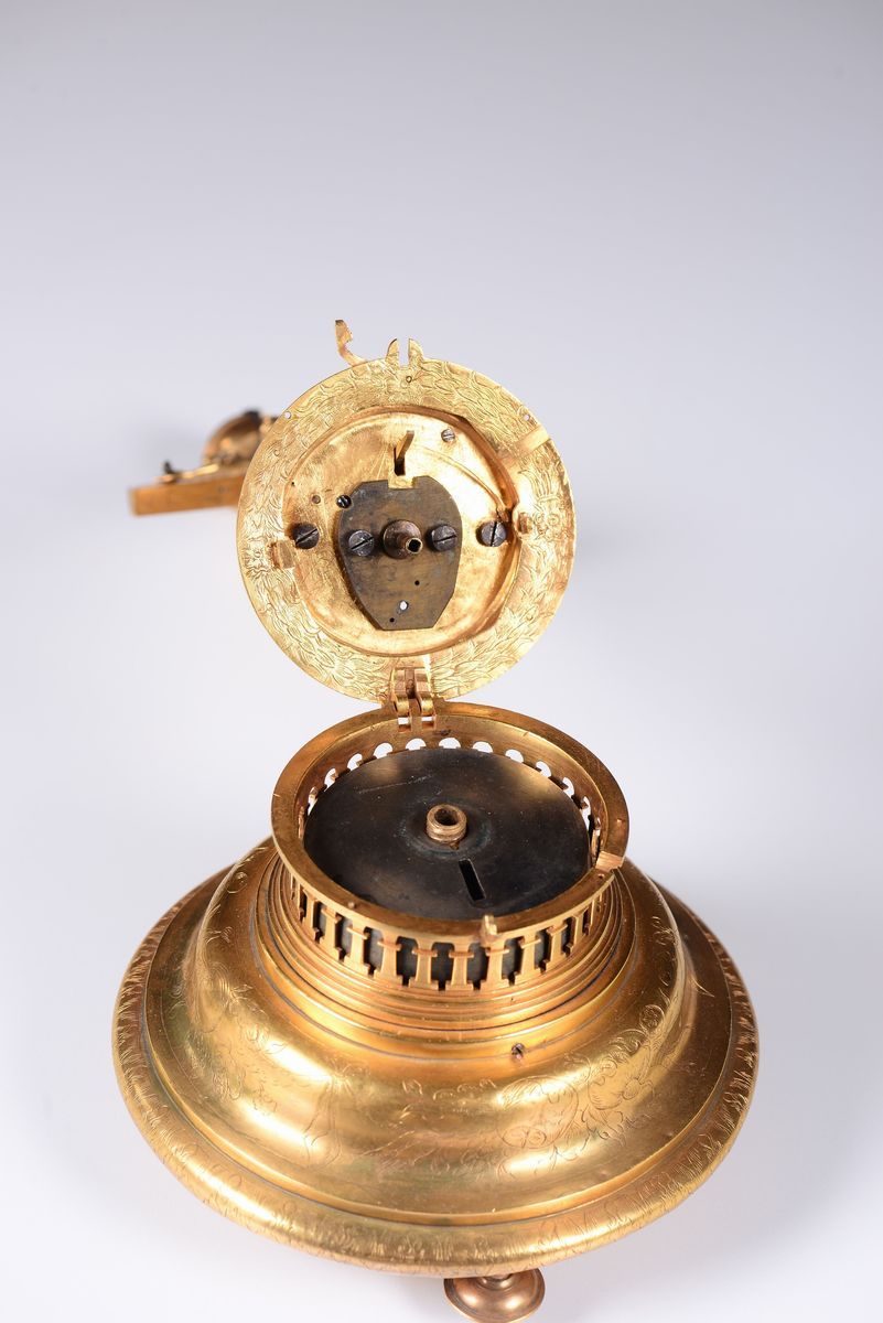 base circolare con decoro inciso a motivo vegetale e floreale, movimento firmato Jacob Mayr in Angelburg.altezza cm 32,5