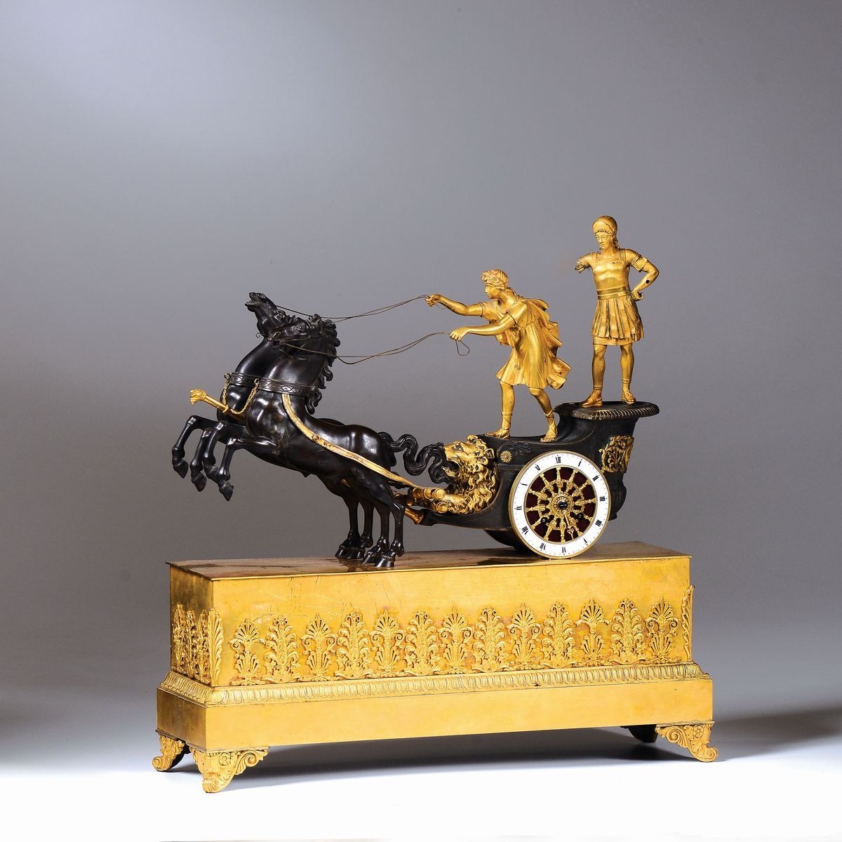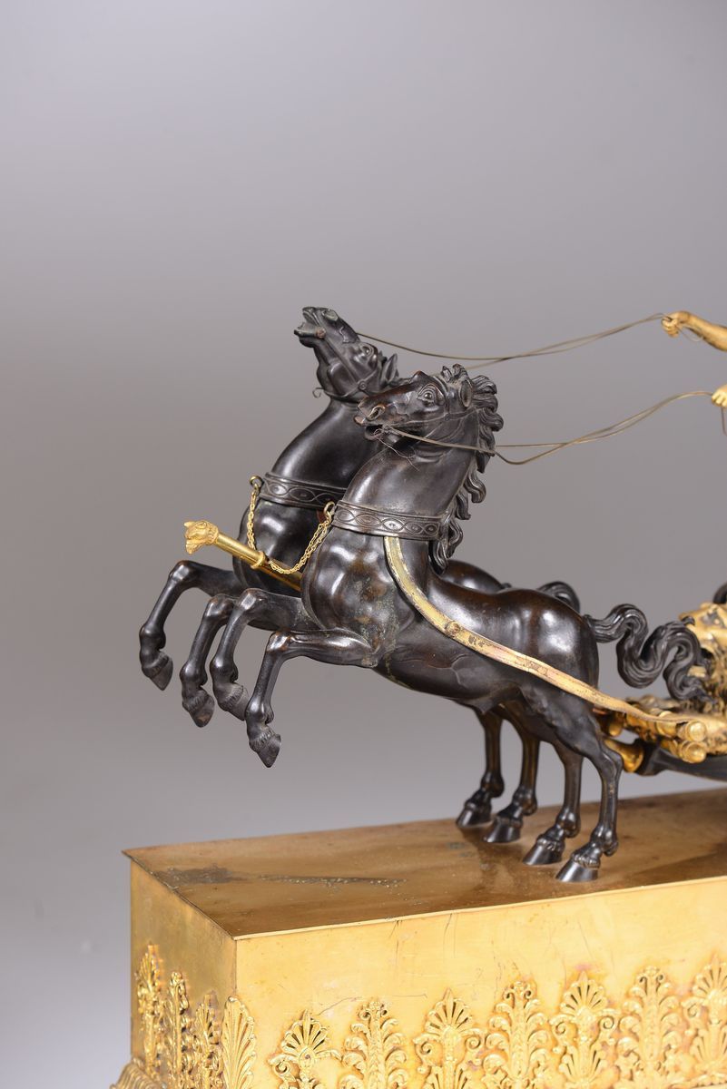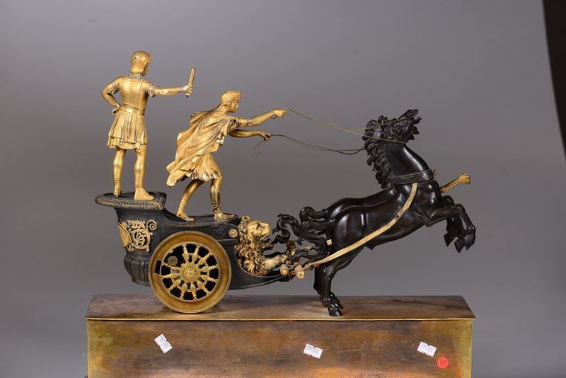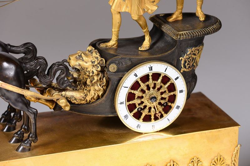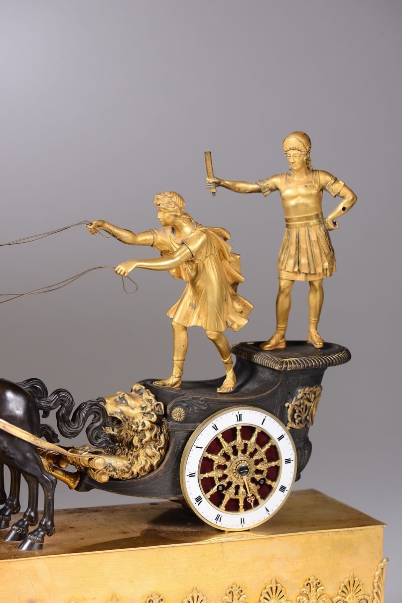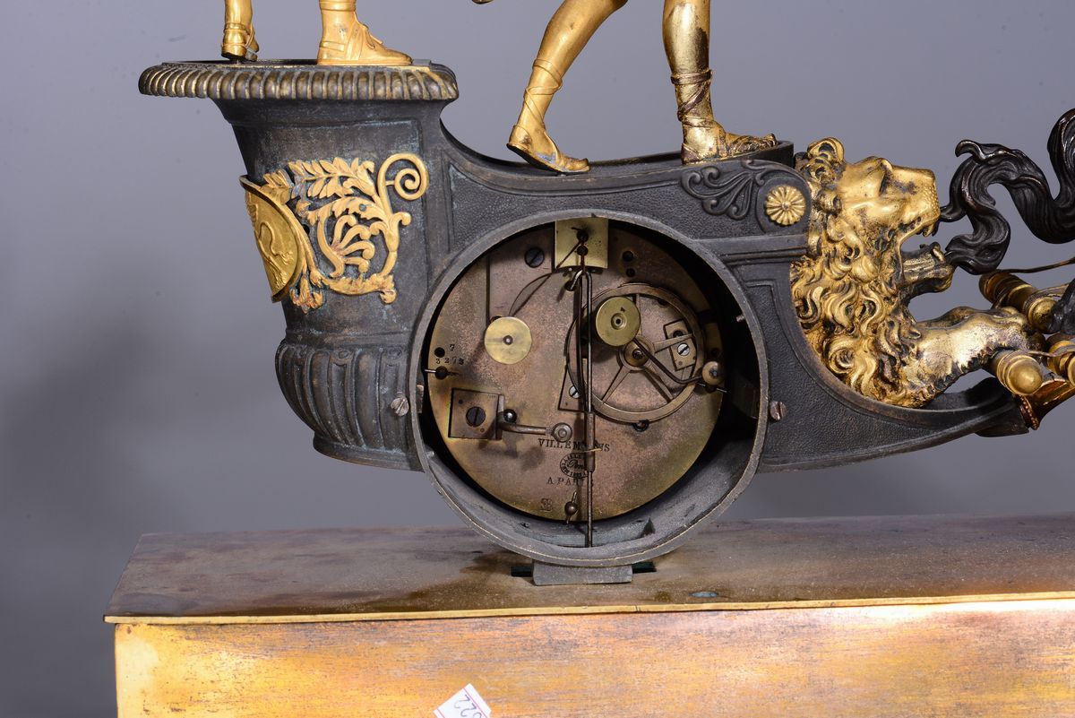 con biga in bronzo brunito e ruote in ottone dorato, una di queste contenente la fascia oraria in smalto bianco con numerazione romana in nero per le ore. Movimento firmato Villemains a Paris. Scappamento ad ancora, suoneria a ore e mezze su campanellocm 51x16x52