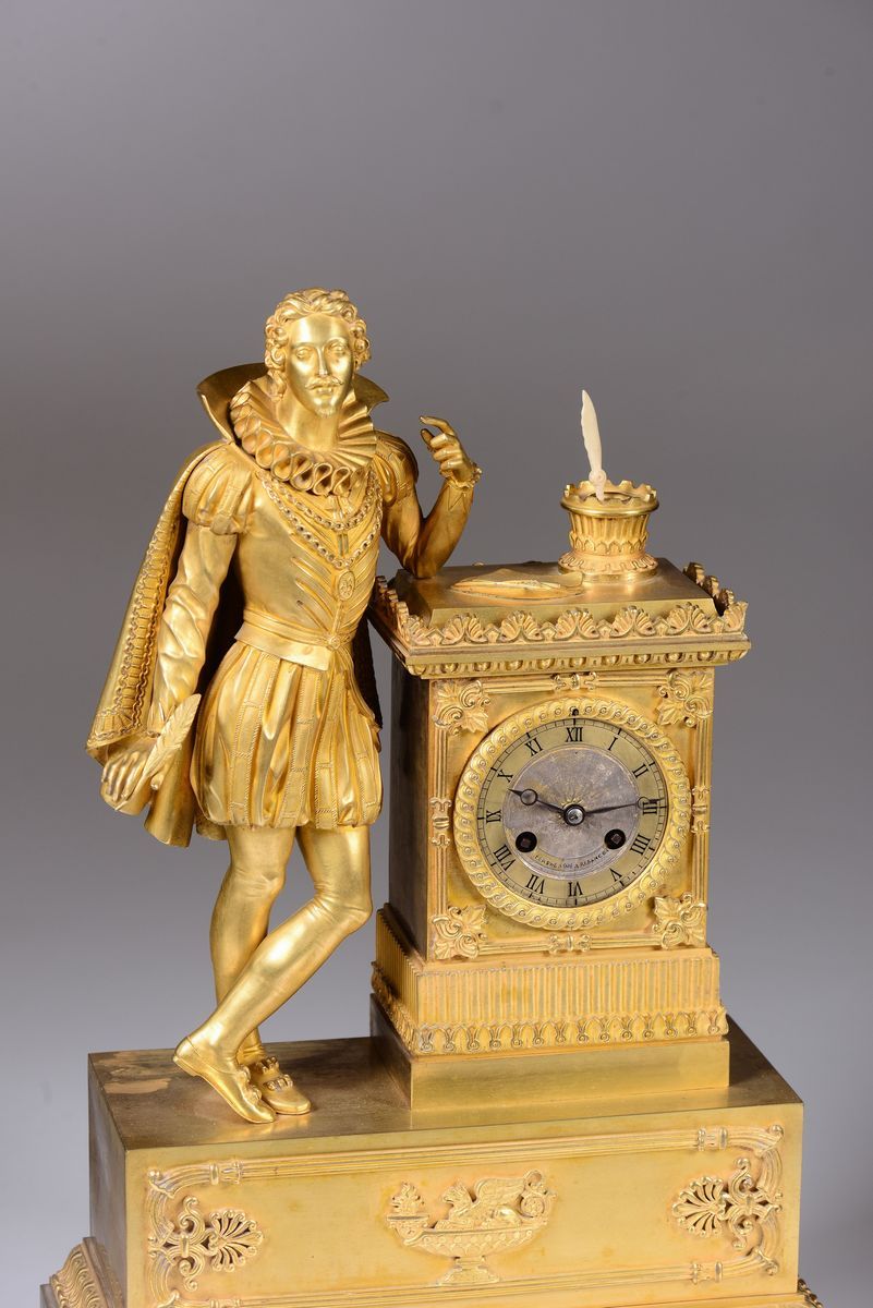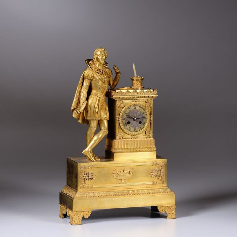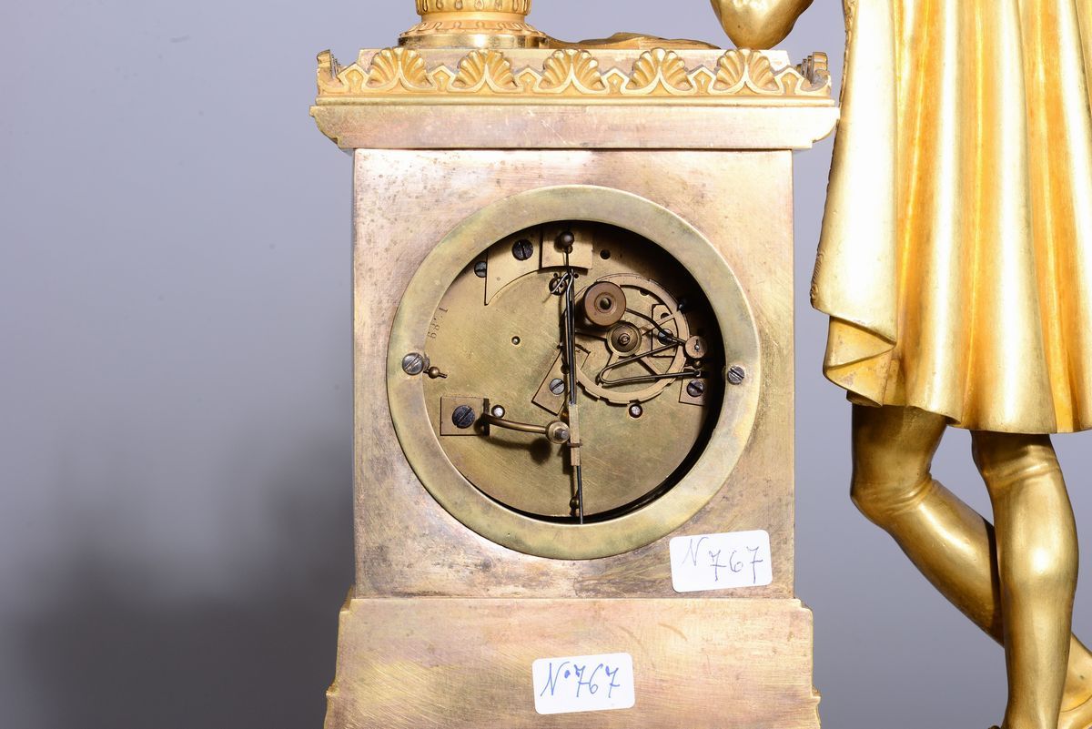 figura maschile a tuttotondo che affianca il quadrante in ottone dorato con numerazione romana in nero e parte centrale incisa e argentata. Scappamento ad ancora con sospensione a filo, suoneria a ore e mezze al passaggio su campanello.cm 33x14x53