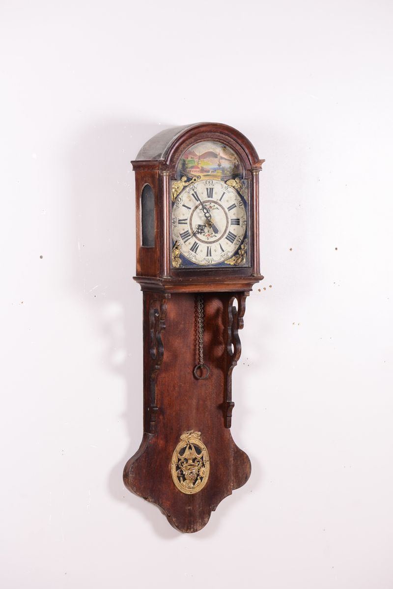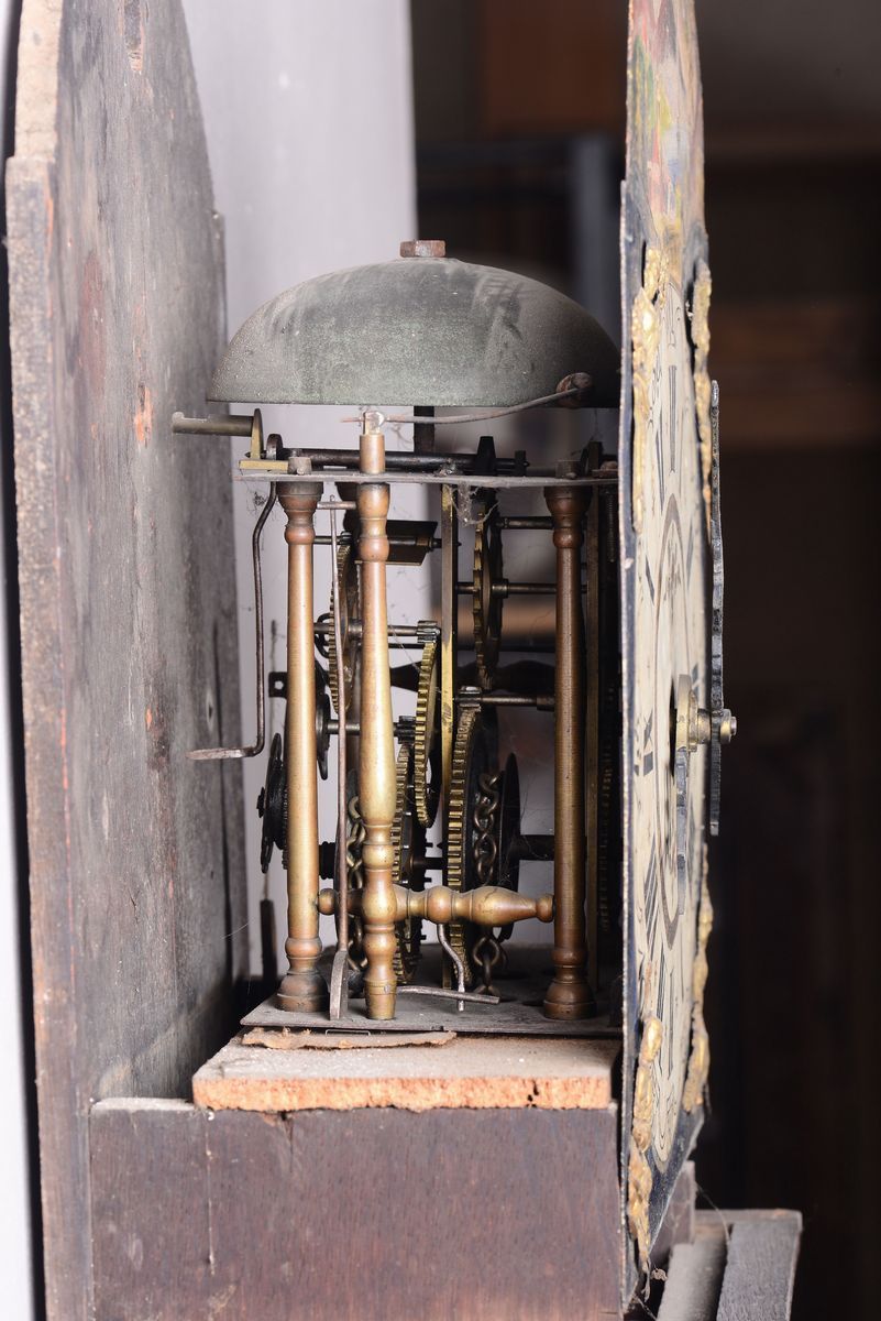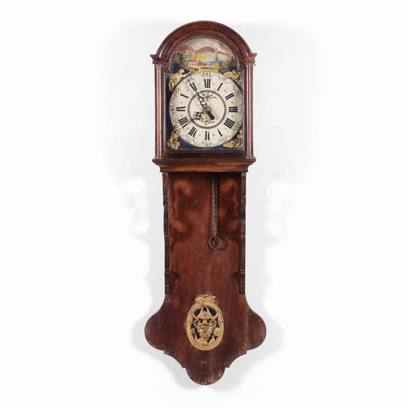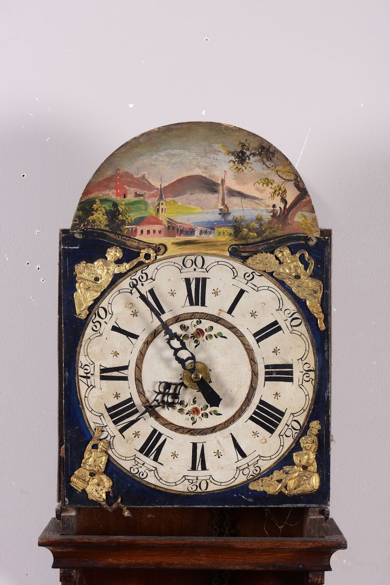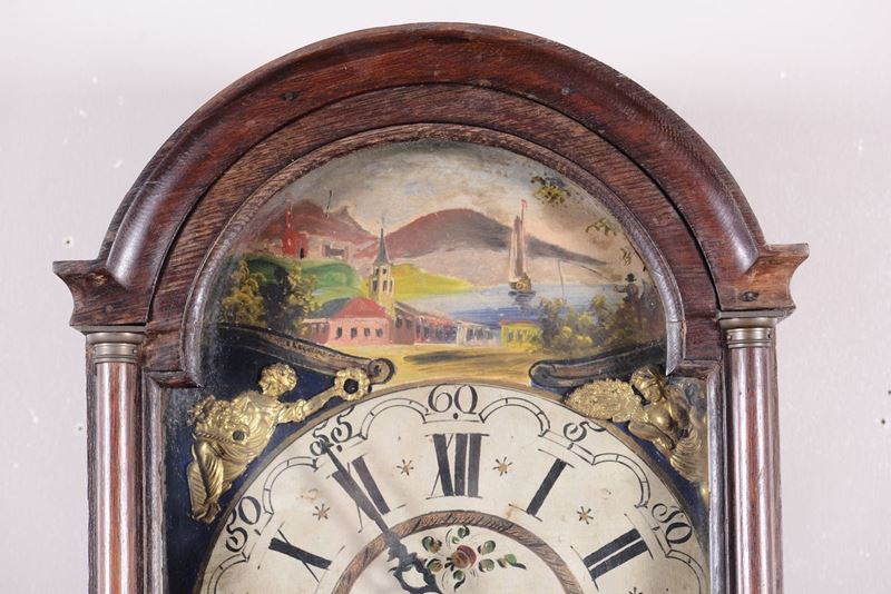 Cassa con colonne con capitelli dorati, quadrante in metallo dipinto con numerazione romana per le ore e araba per i minuti sormontato da dipinto policromo con paesaggio costiero. Scappamento ad ancora e carica giornaliera, suoneria a ore e mezze al passaggio su campana.cm 35x20x126