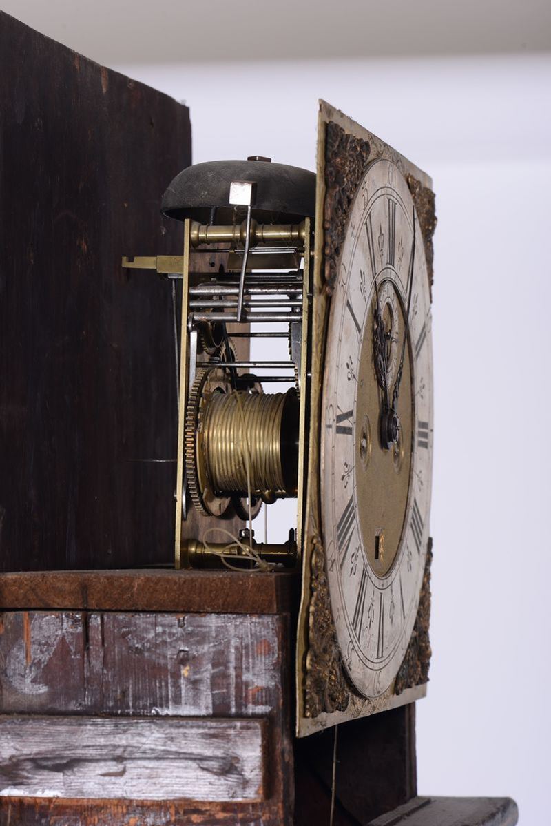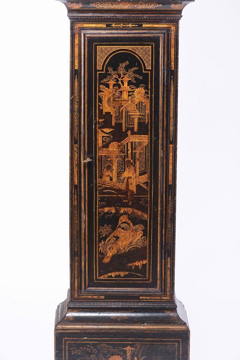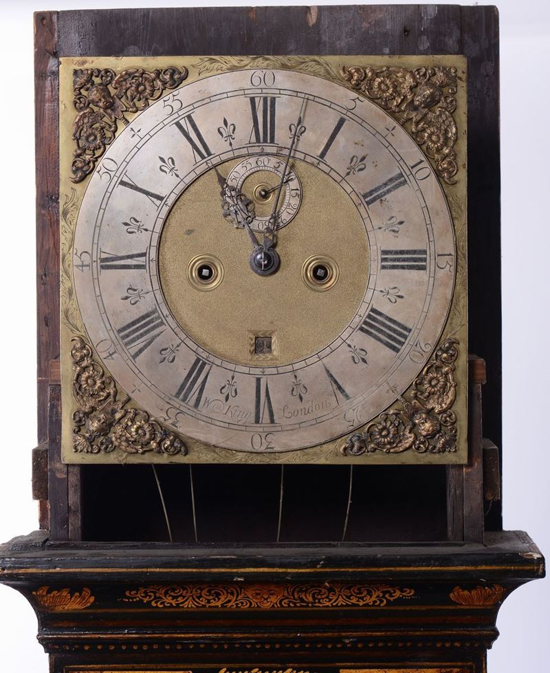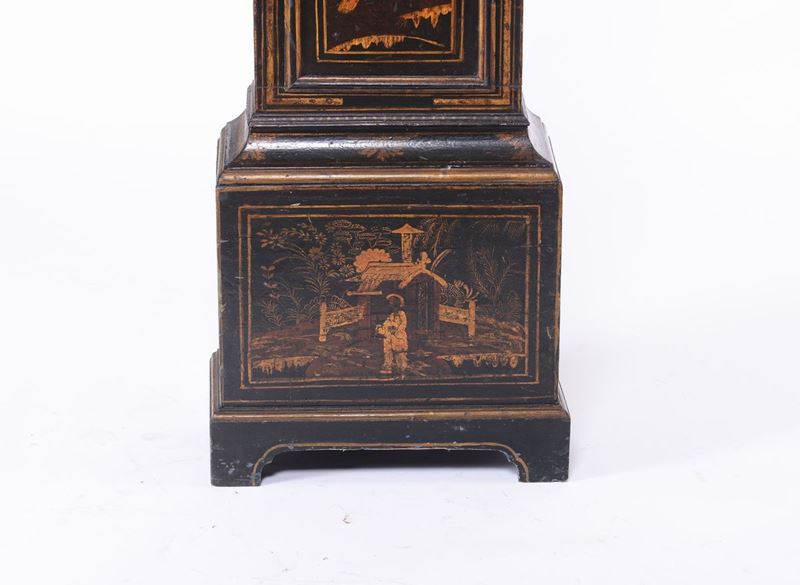 Cassa in legno laccato a chinoiserie. Quadrante con fascia oraria circolare in metallo argentato a numerazione romana in nero per le ore; al centro quadrantino per la sveglia. Scappamento ad ancora, suoneria a ore e mezze al passaggio su gongcm 50x26x191