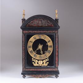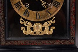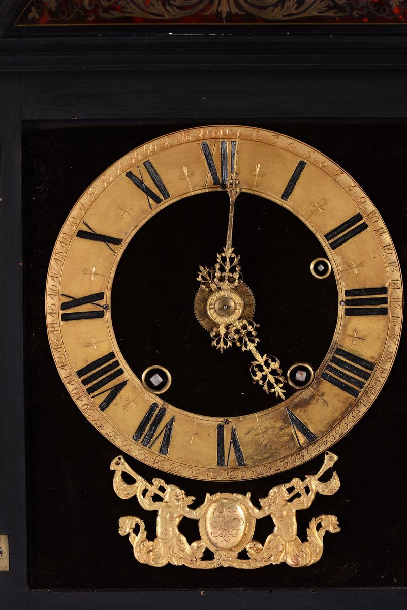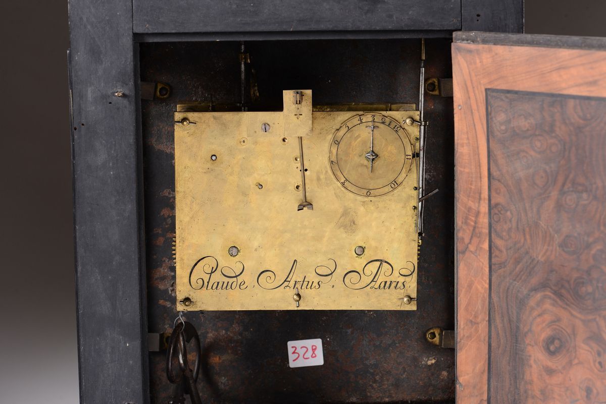 Cassa in legno ebanizzato e lastronato in tartaruga con inserti in ottone dorato. Quadrante circolare in ottone dorato con numerazione romana in nero per le ore e araba per i minuti; cartiglio sottostante recante la firma Claude Artus a Paris. Scappamento ad ancora (modificato), suoneria a ore e mezze al passaggio cm 30x15x54