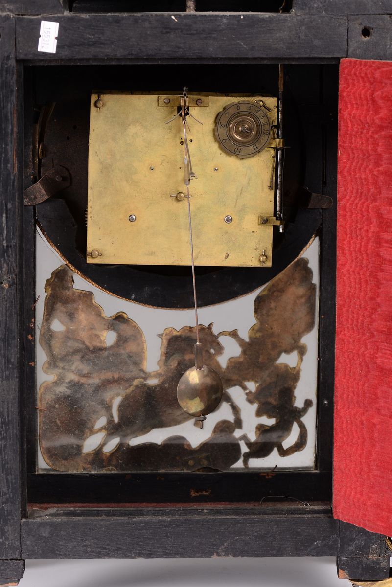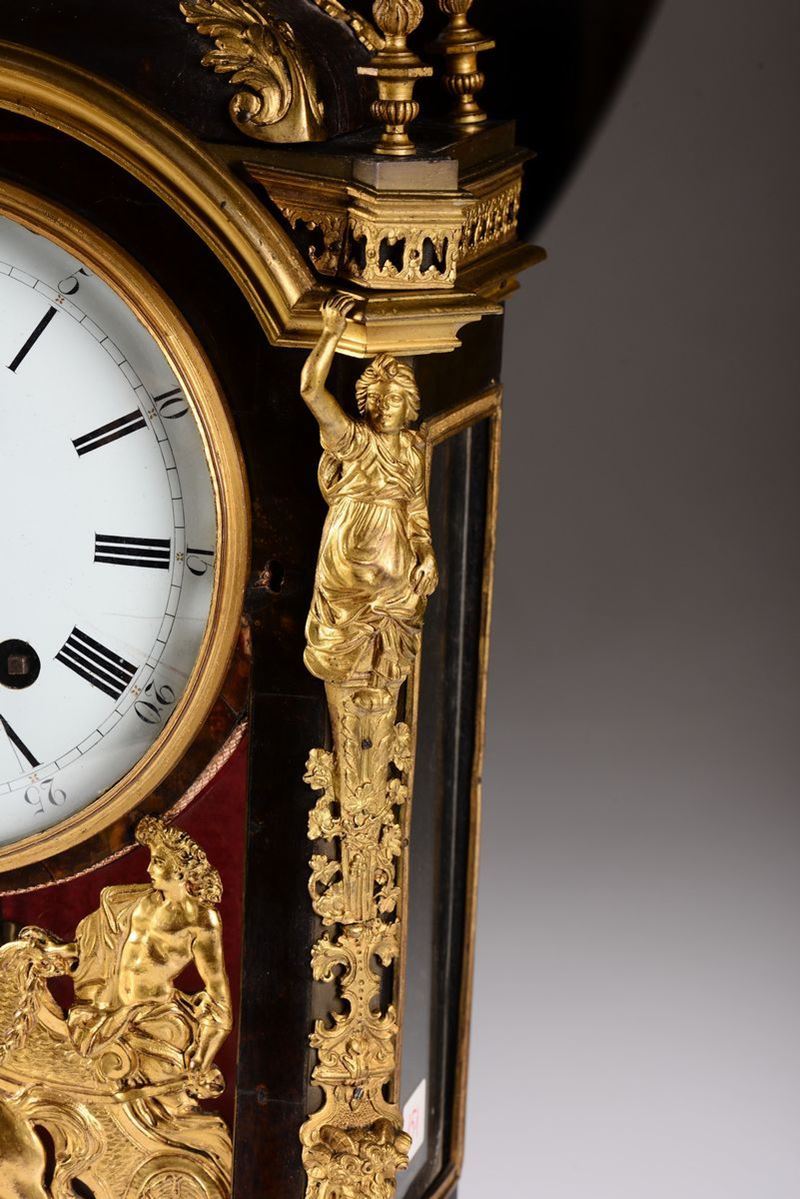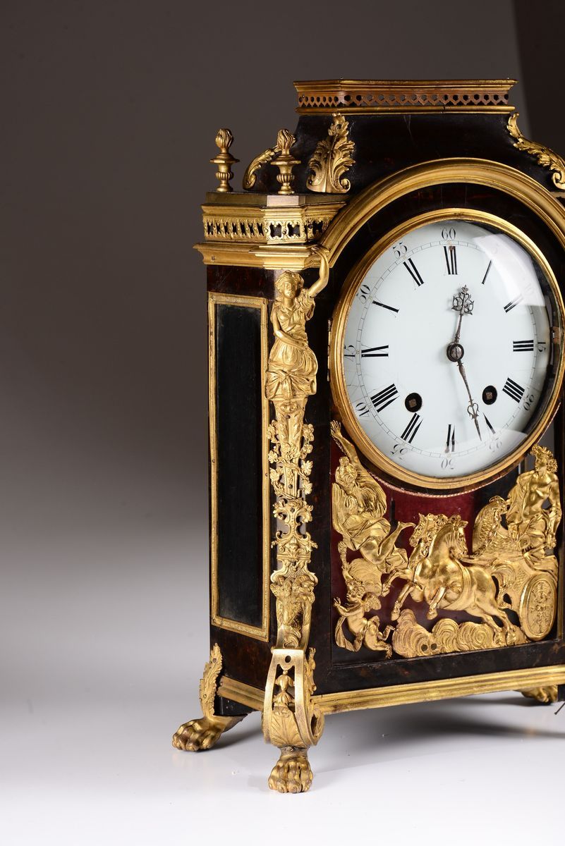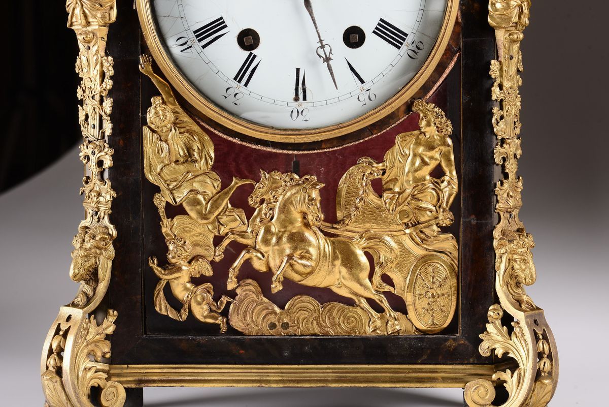 Cassa lastronata in tartaruga con finiture e guarnizioni in bronzo dorato. Quadrante in smalto bianco con numerazione romana in nero per le ore e araba per i minuti. Fregio applicato sottostante con figura mitologica su biga e amorino. Montanti con figure di cariatidi e motivi di uva e vite. Piedi ferini. Scappamento a verga, suoneria a ore e mezze al passaggio. Quadrante non originale. cm 36x16x55