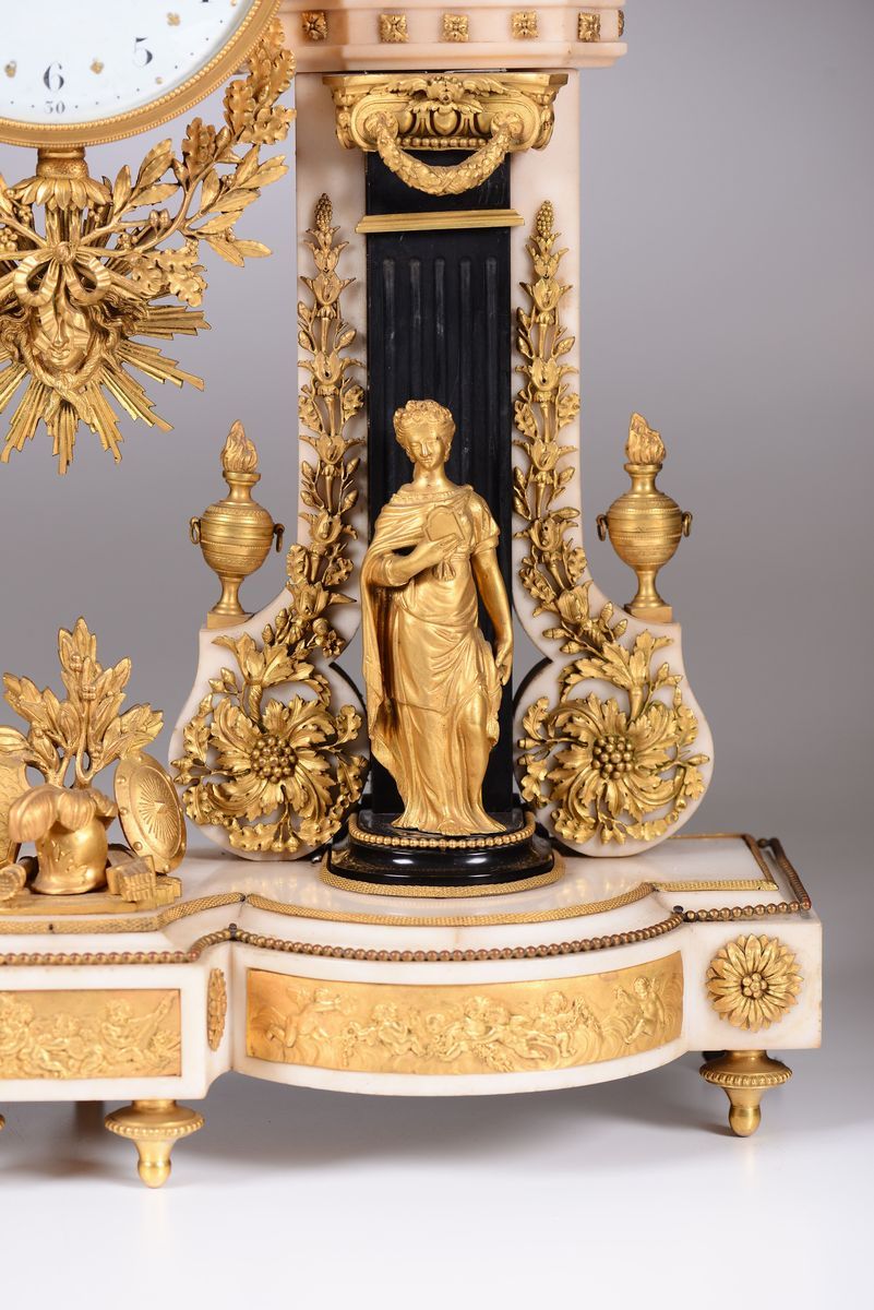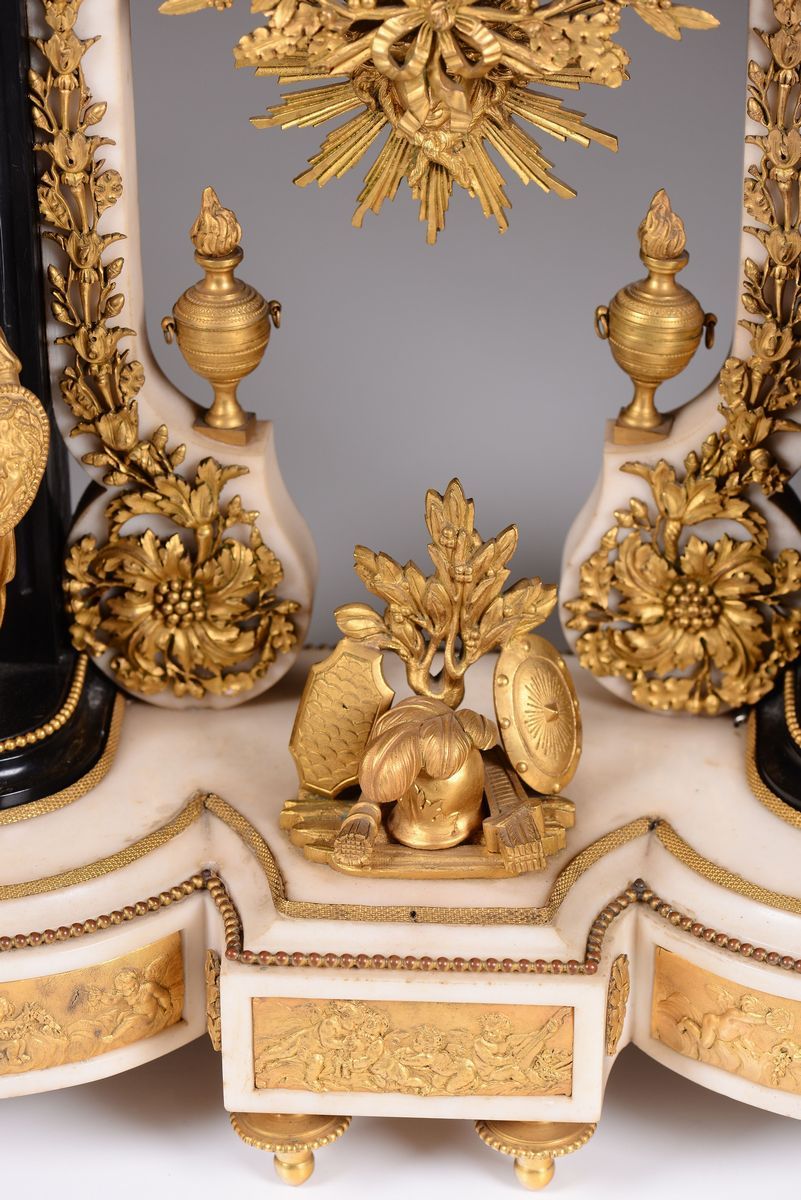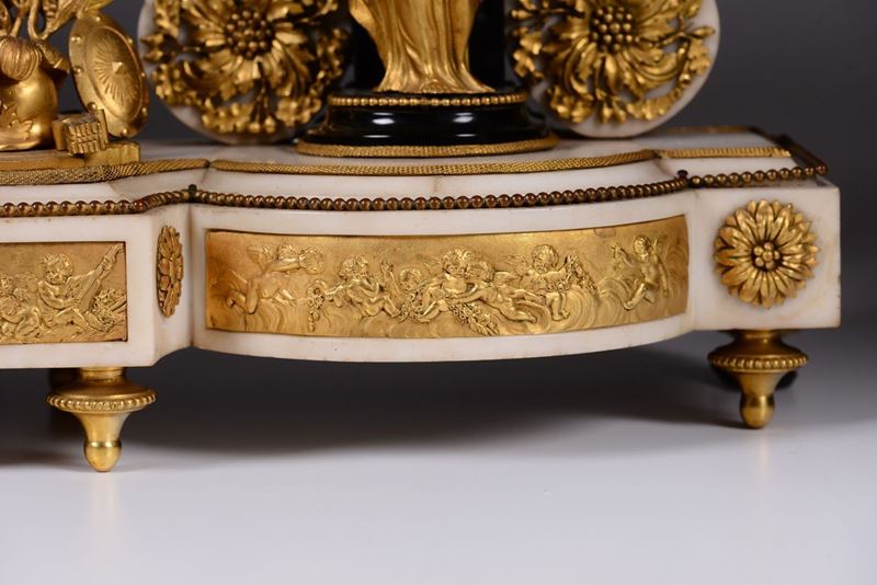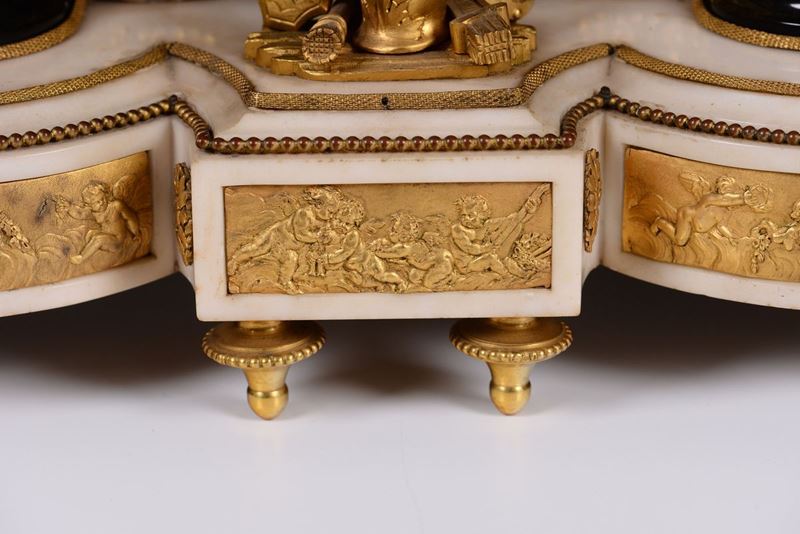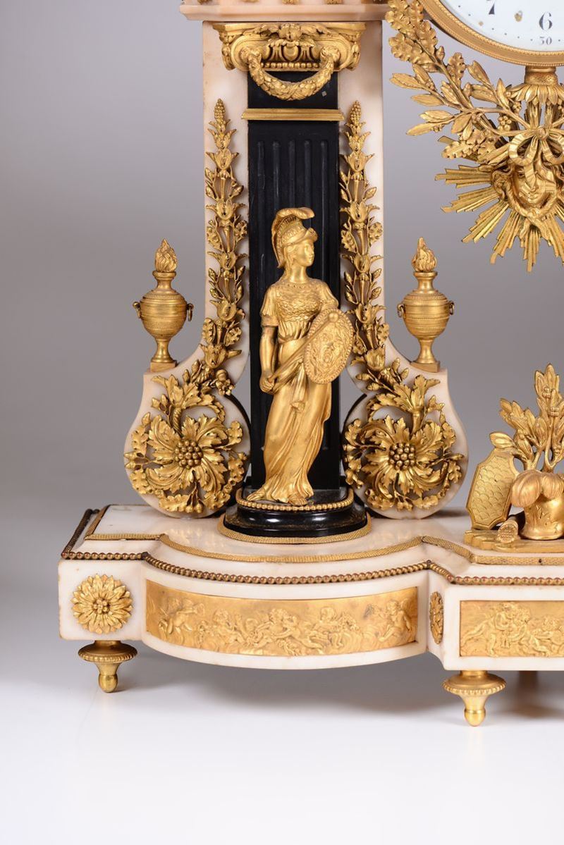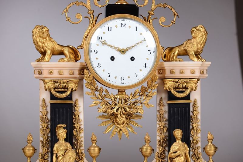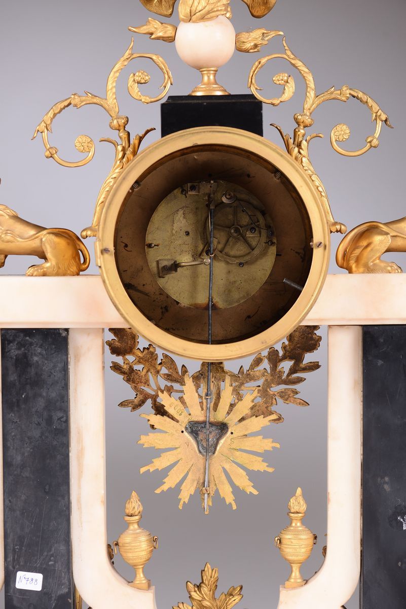 Cassa in marmo bianco e fregi in bronzo dorato; base scantonata con colonne scanalate e figure classiche a tuttotondo con trofeo d’armi centrale. Quadrante in smalto bianco con numerazione araba in nero per le ore ed i minuti affiancato da leoni e sormontato da aquila. Meccanica (del 1830) con scappamento ad ancora e sospensione a filo, suoneria a ore e mezze al passaggio.cm 58x18x75