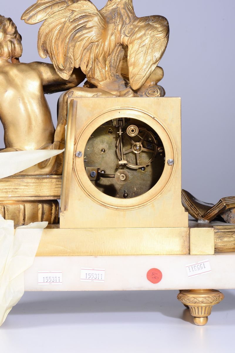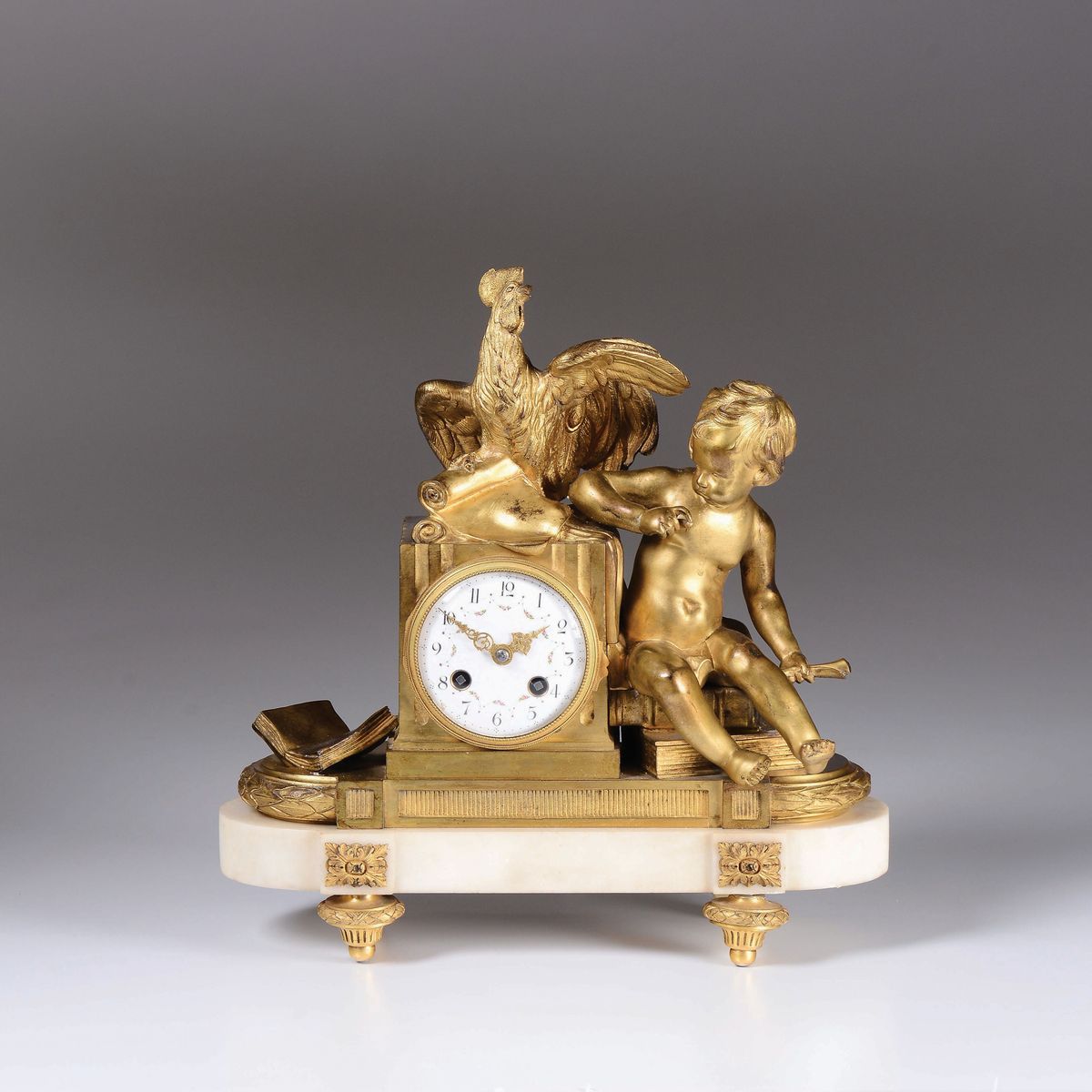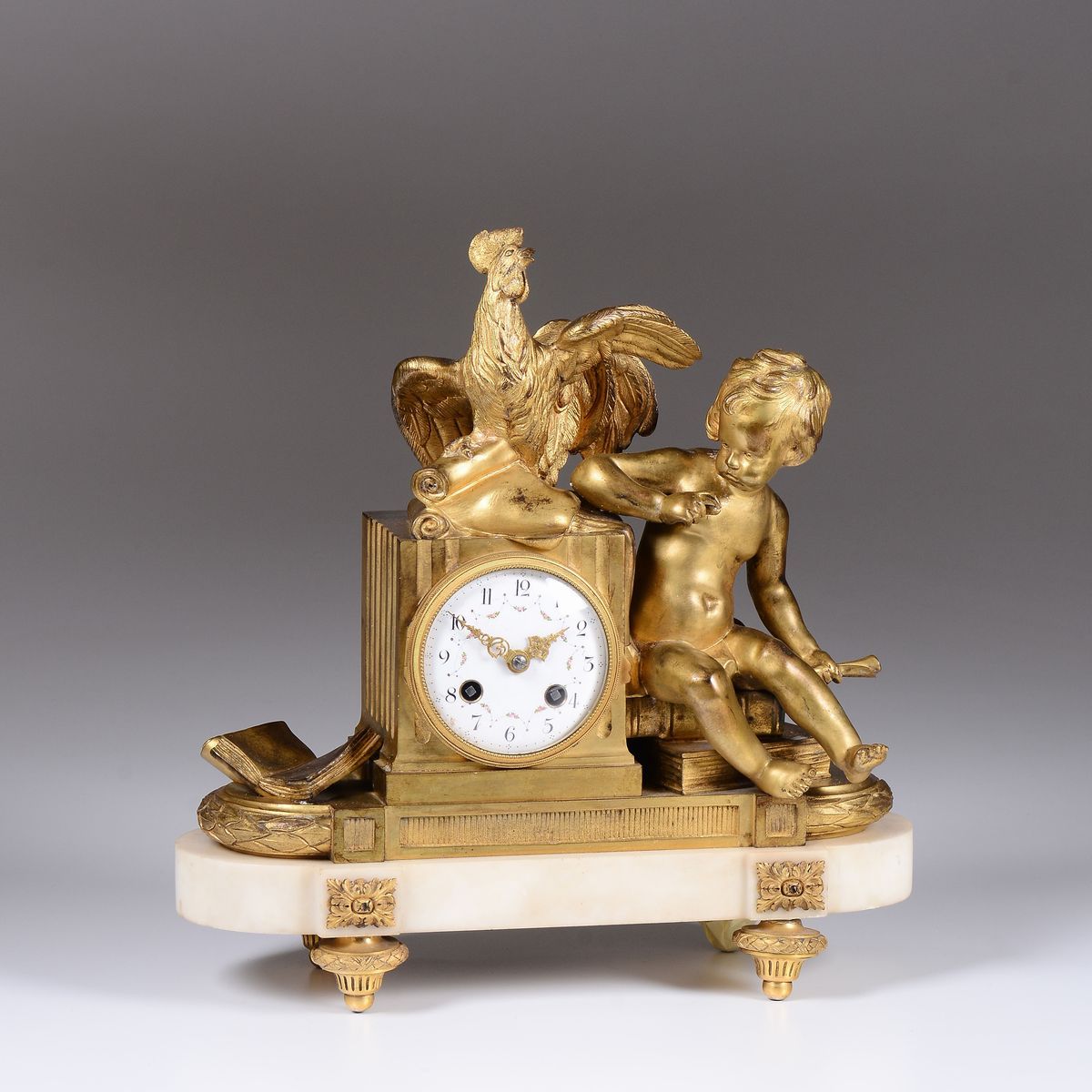 Cassa in bronzo dorato con putto a tuttotondo e gallo. Quadrante in smalto bianco con numerazione araba in nero per le ore e festoni floreali dipinti in policromia. Base ovale in marmo bianco. Scappamento ad ancora con sospensione a lamella, suoneria con ruota partitora ad ore e mezze al passaggio.cm 33x14x35