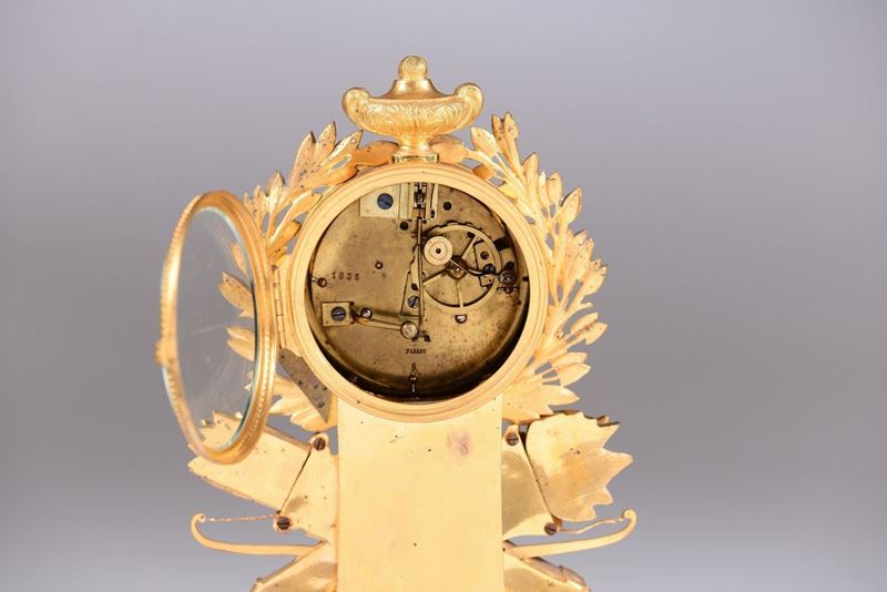 Cassa in bronzo dorato raffigurante allegoria dell’autunno. Quadrante in smalto bianco con numerazione romana in nero per le ore e araba per i minuti. Base scantonata in marmo bianco. Scappamento ad ancora, suoneria a ore e mezze su campanello.cm 24x10x29