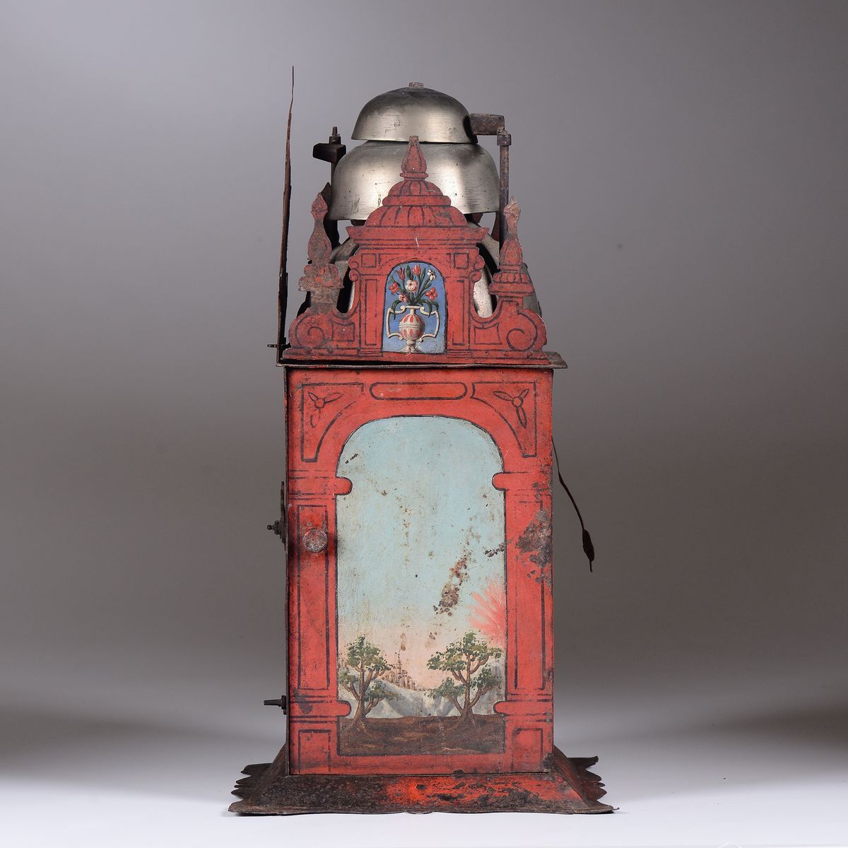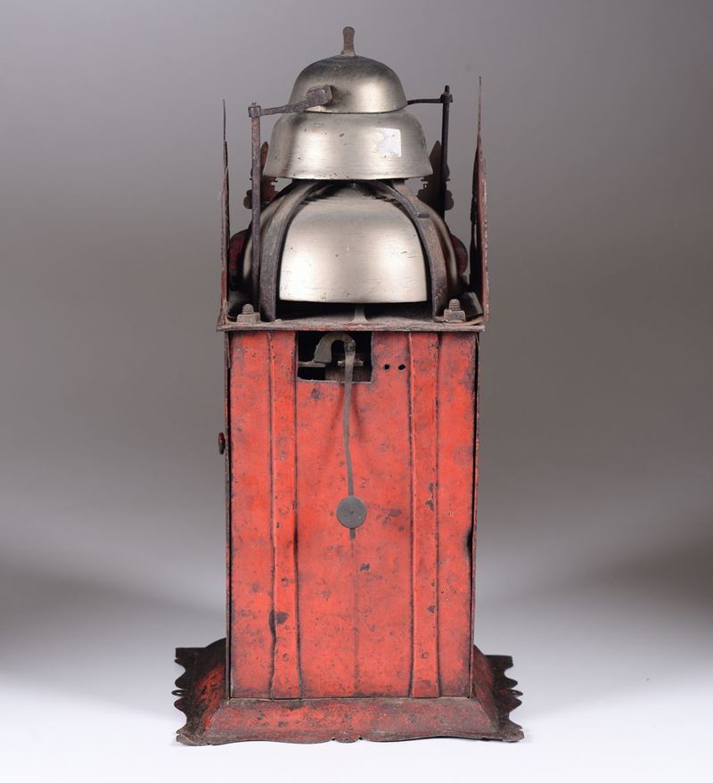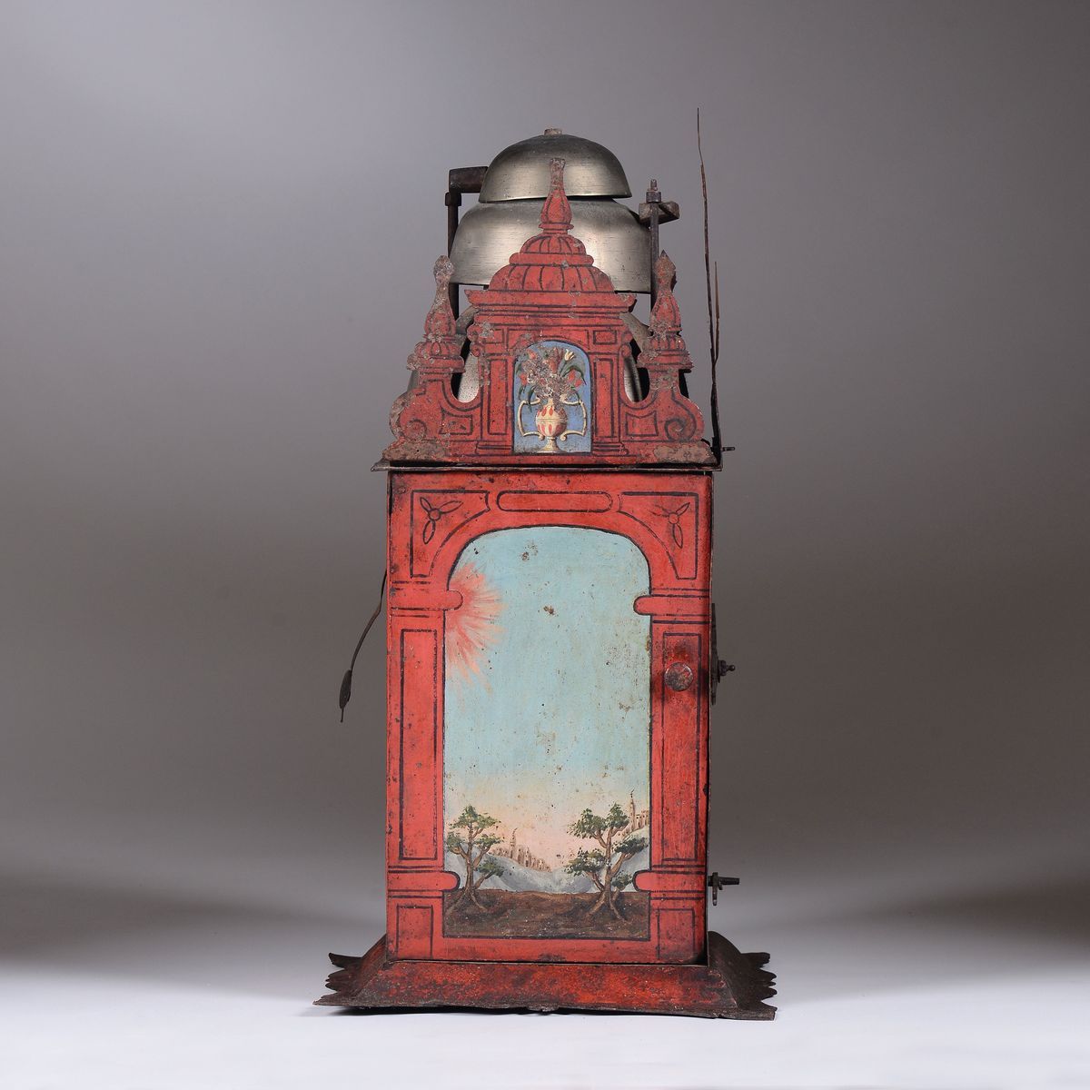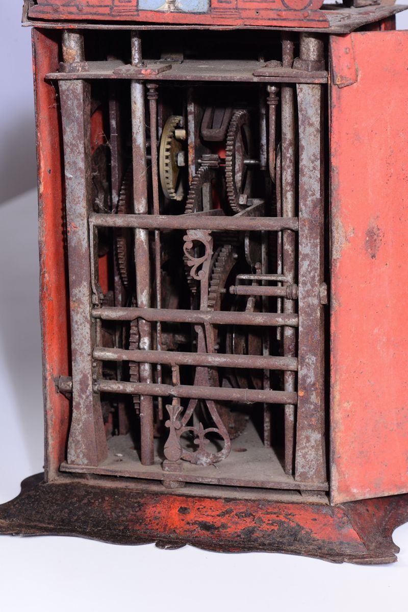 Cassa di foggia architettonica in metallo dipinto in policromia su fondo rosso. Fianchi decorati da paesaggi con vasi fioriti soprastanti; fronte con quadrante e svegliarina a numerazione romana per le ore e araba per i minuti. Meccanica in ferro con scappamento a verga, suoneria a ore e quarti su campane, e svegliacm 29x28x55