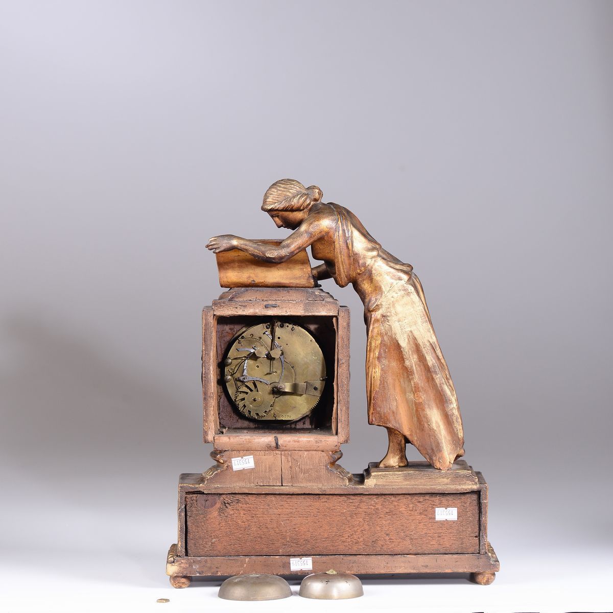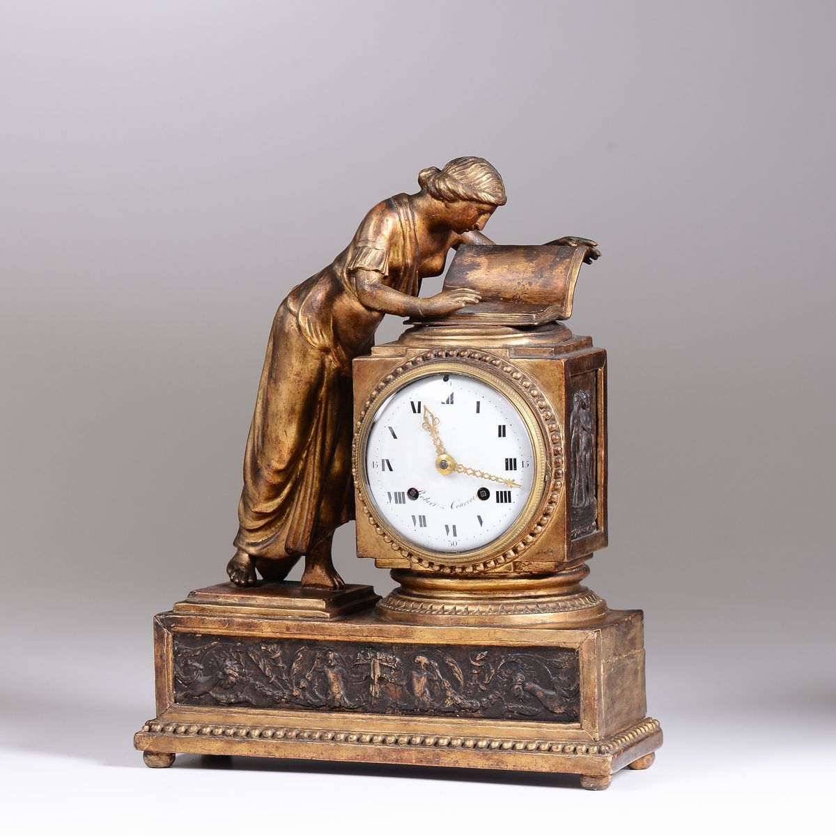 Cassa in legno intagliato, scolpito e dorato. Il quadrante in smalto bianco con numeri romani neri è inserito in un plinto con fregi a rilievo al quale si appoggia una figura femminile intenta a leggere. Movimento rotondo in ottone, scappamento a verga, suoneria ore e quarti su campanello a passaggio. Firmato sul quadrante Robert et Courvoisier.cm 40x30x12