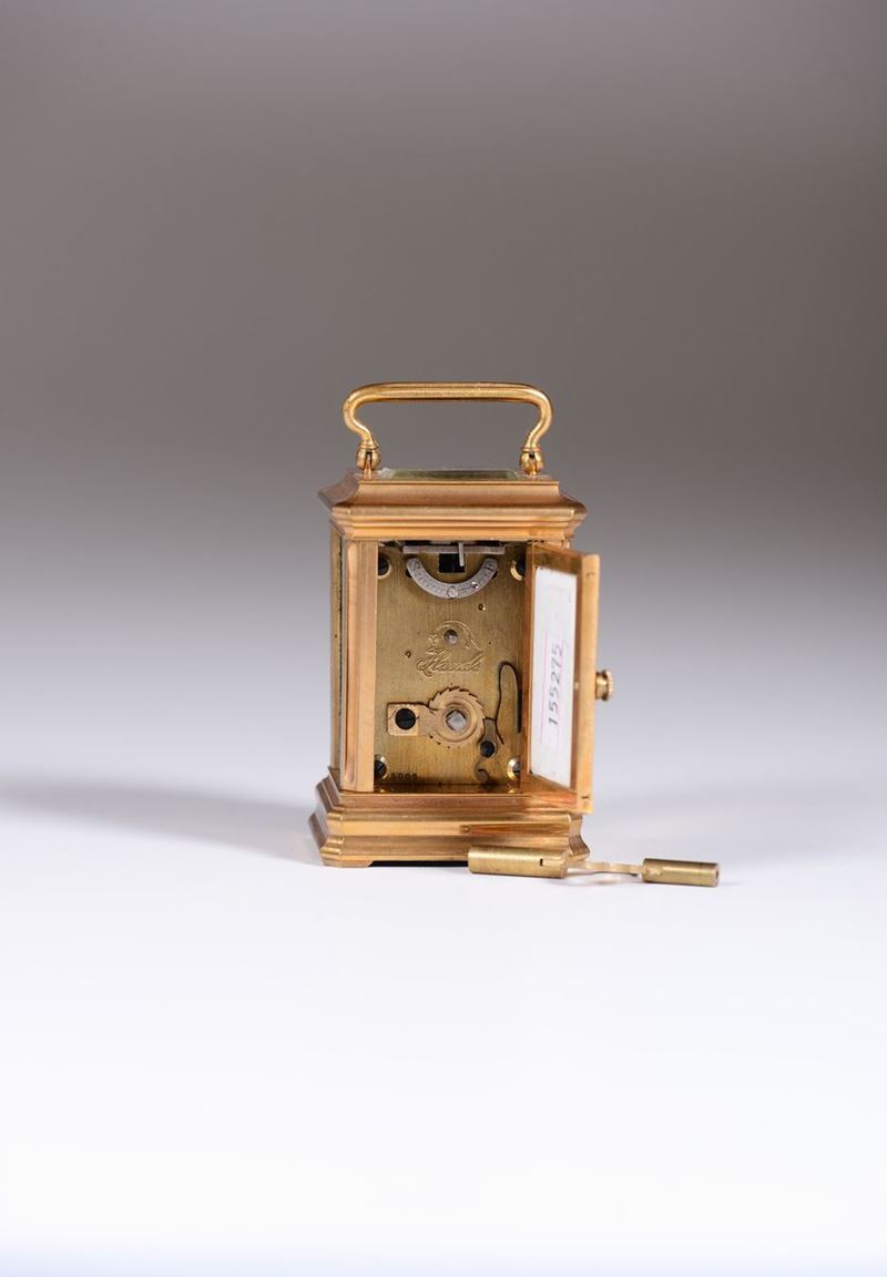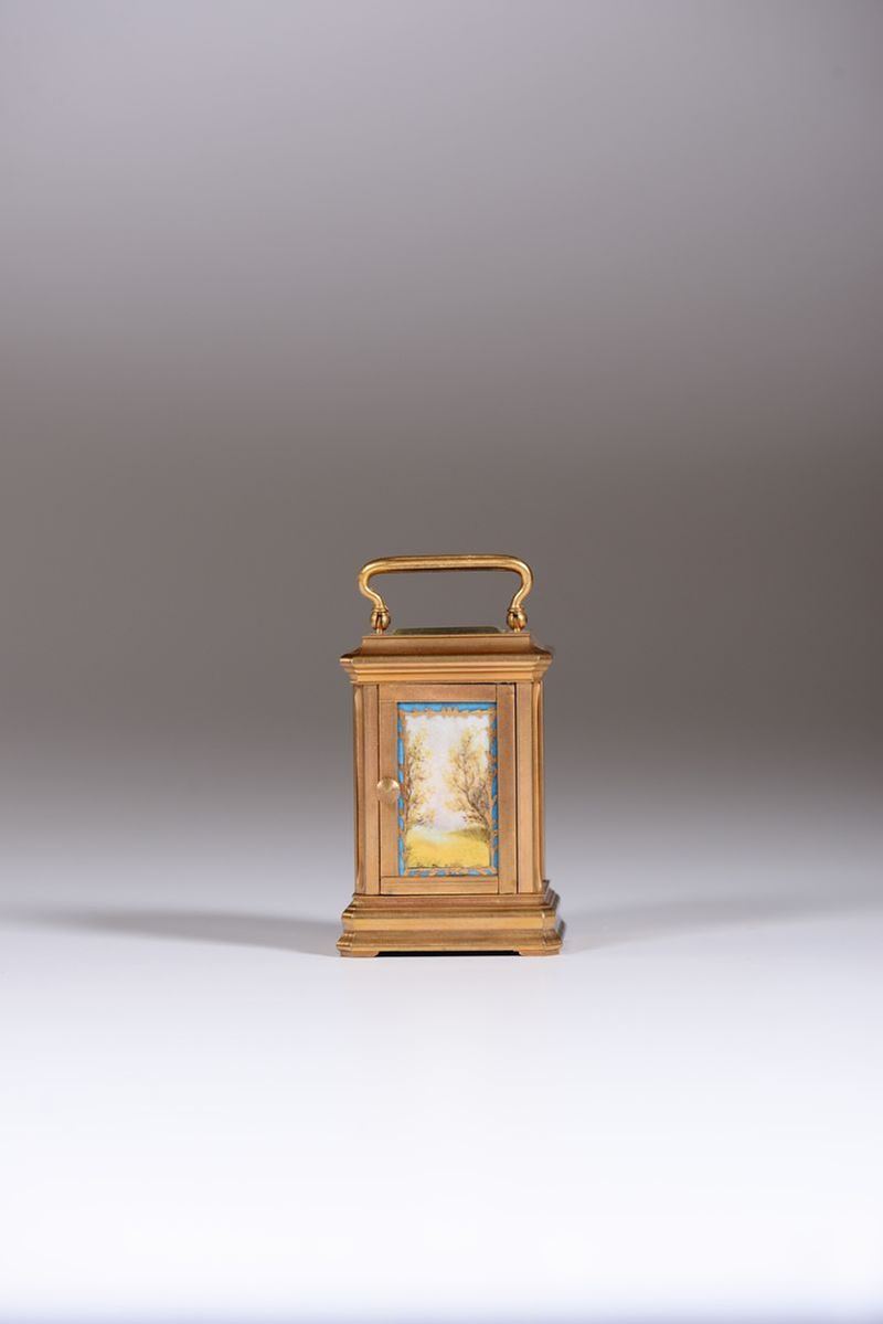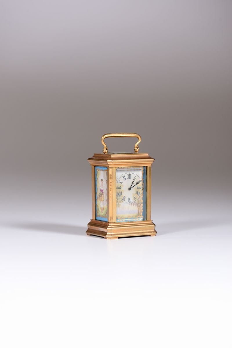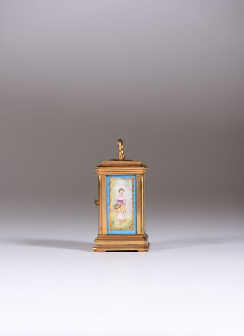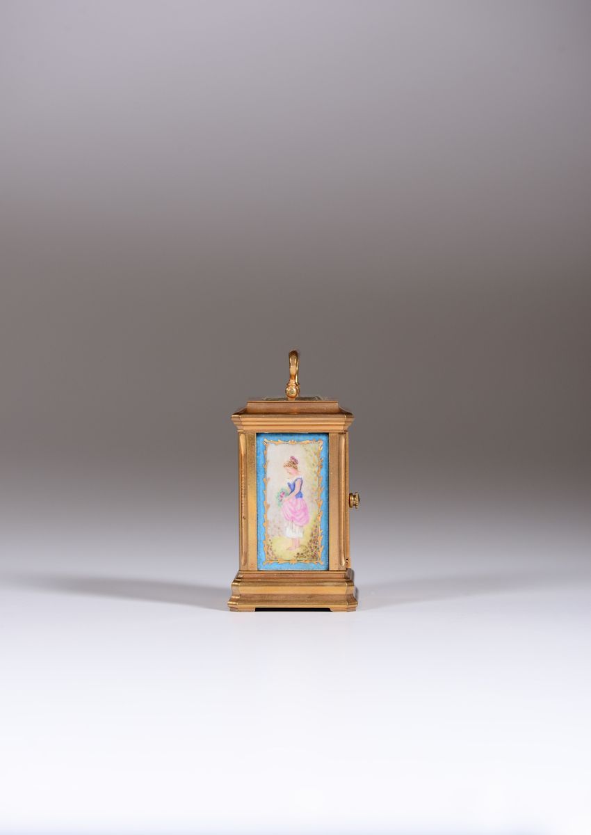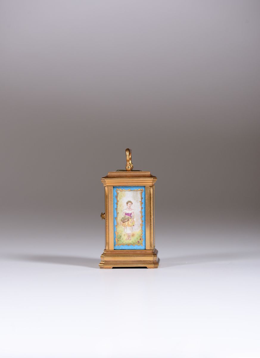 Quadrante con numerazione romana in nero per le ore. Decori policromi con paesaggi sul fronte ed un fianco e figura di contadina sull’altro.cm 5x4,5x7,5