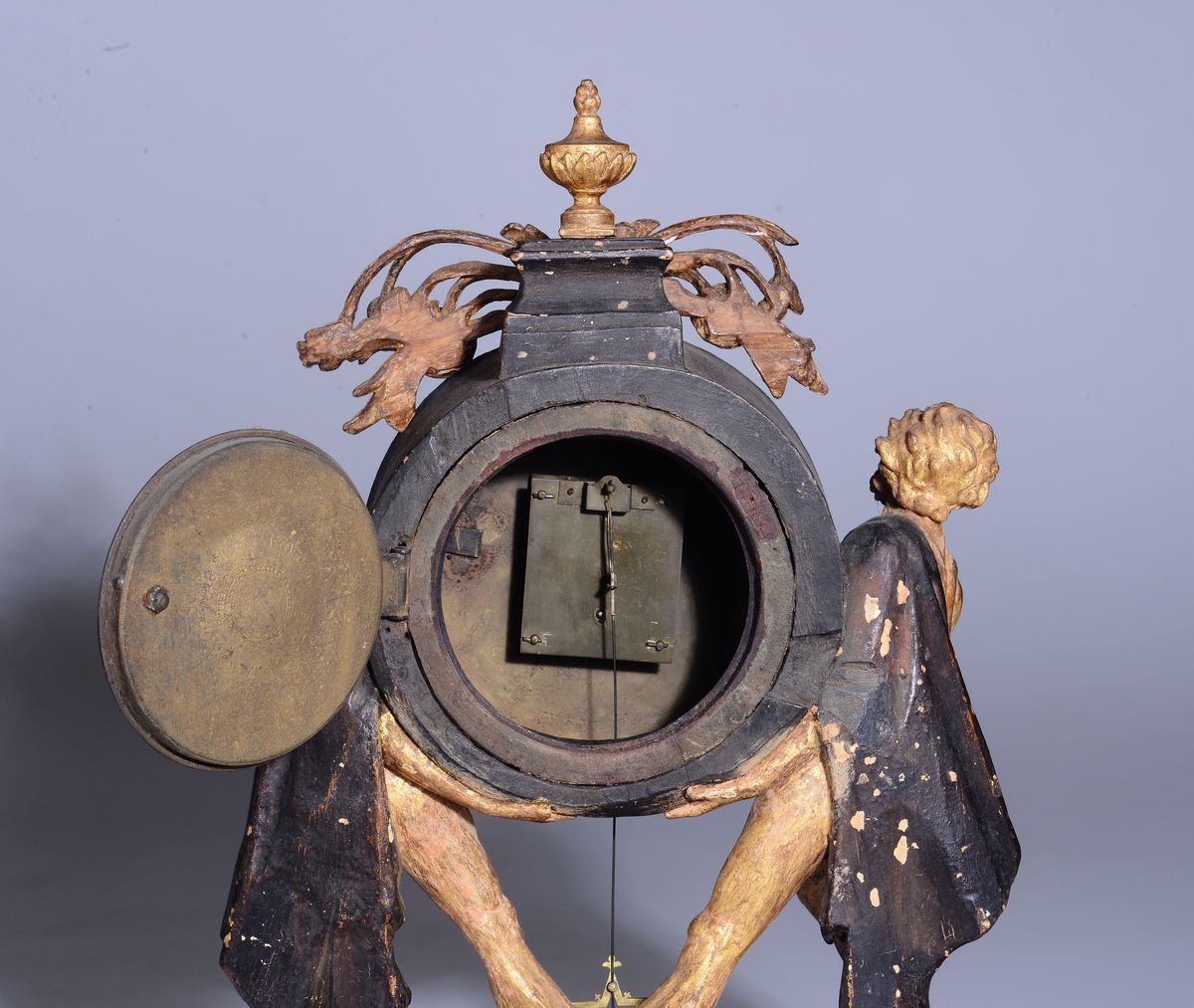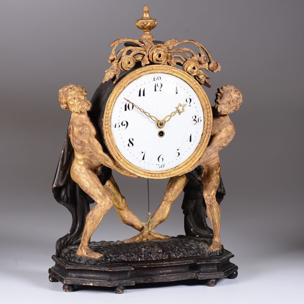 Due figure maschili a tuttotondo sorreggono il quadrante circolare in smalto bianco con numerazione araba in nero per le ore. Base sagomata pogginate su piedini sferici. Meccanica solo tempo con scappamento ad ancora.cm 32x14x47