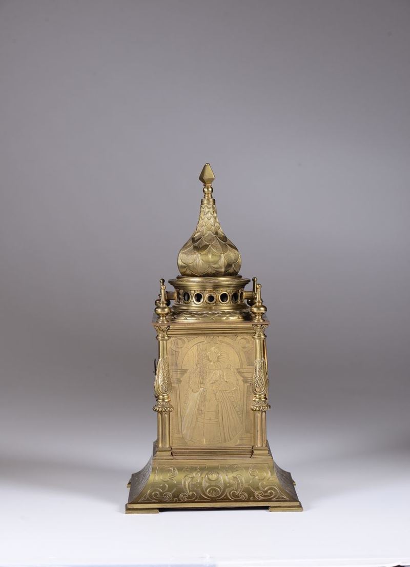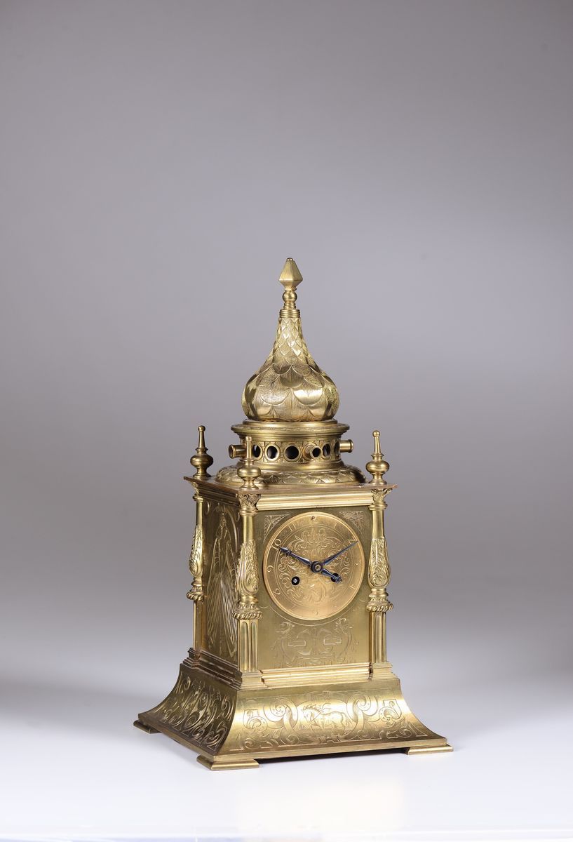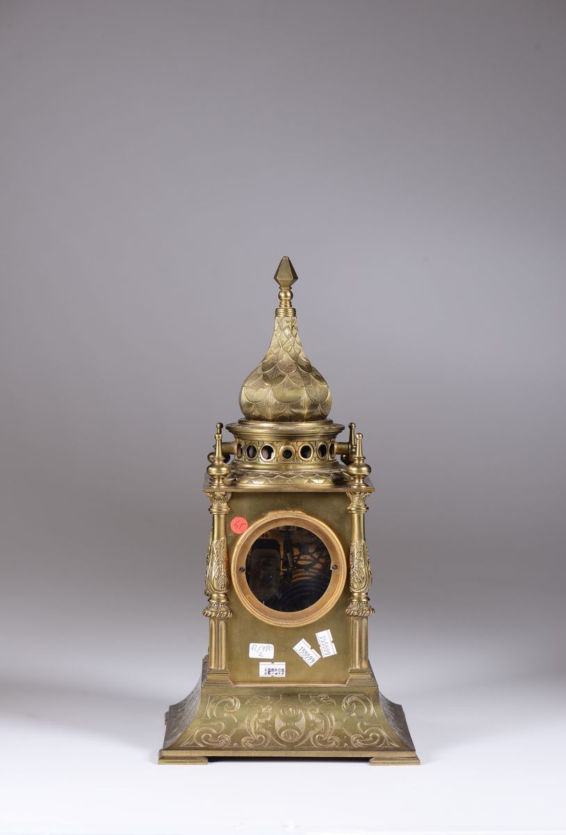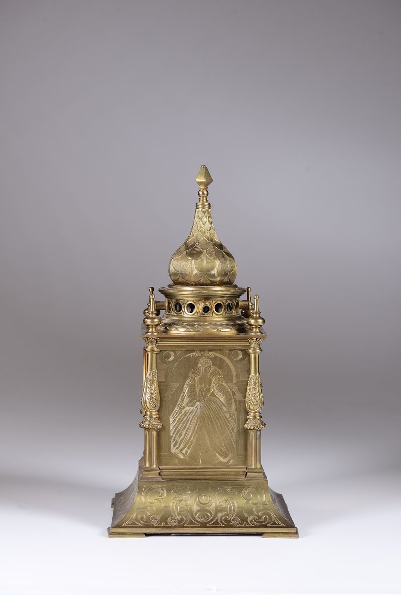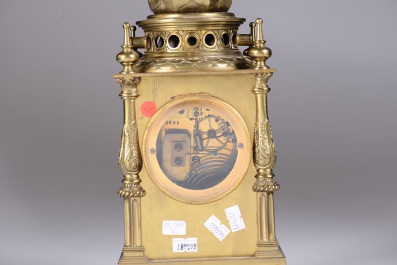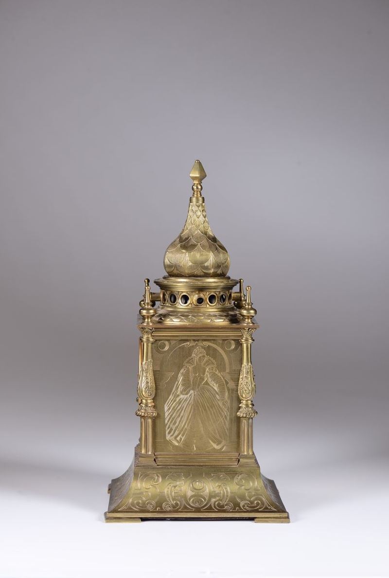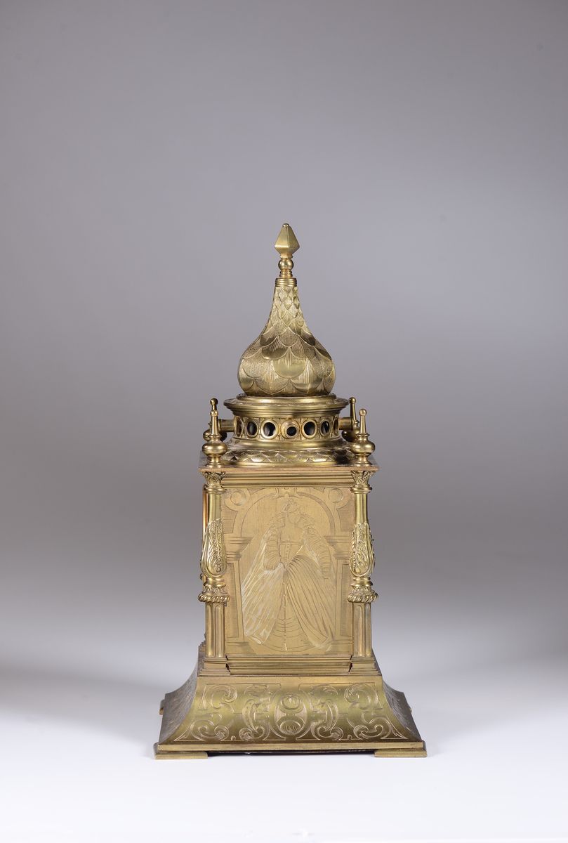 La cassa è incisa sia alla base che sui lati, dove sono raffigurate due dame in vesti cinquecentesche. Quadrante in ottone in XII, in cifre arabe, con due lancette e due fori di carica. Movimento firmato Planchon - Palais Royal, con suoneria delle ore e delle mezze a partitora.cm 21x21x41