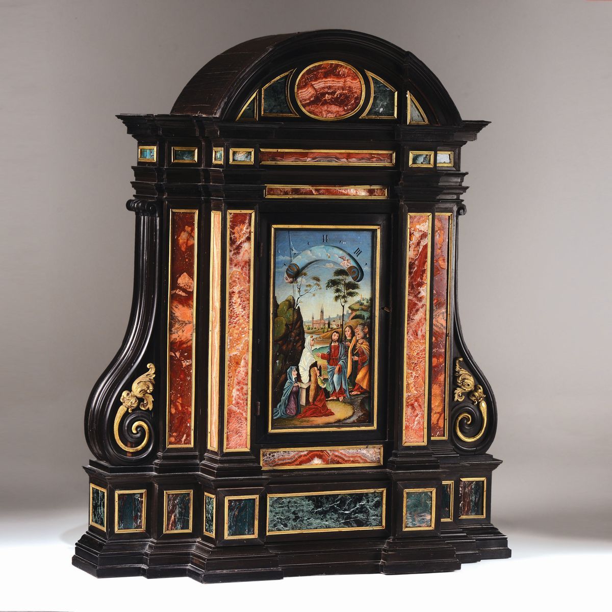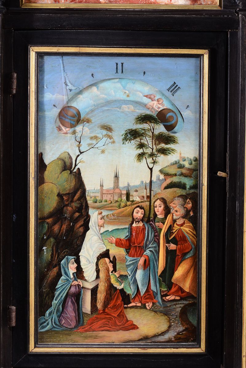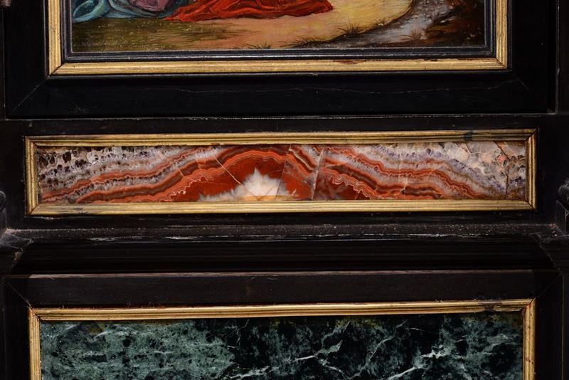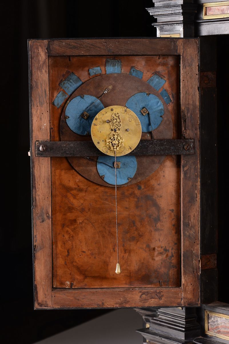 Di foggia architettonica, con scanalature sui fianchi ed un cassetto alla base, decorazioni con pannelli in pietre dure levigate nei toni del rosso e verde entro riserve dorate. Quadrante non coevo dipinto su rame con Cristo e i discepoli entro paesaggio, nella parte superiore un’apertura rivela le ore scandendole per quarti d’ora. Il movimento reca la firma Gio Monginot, Fiorenze; scappamento a verga.cm 71x21x84