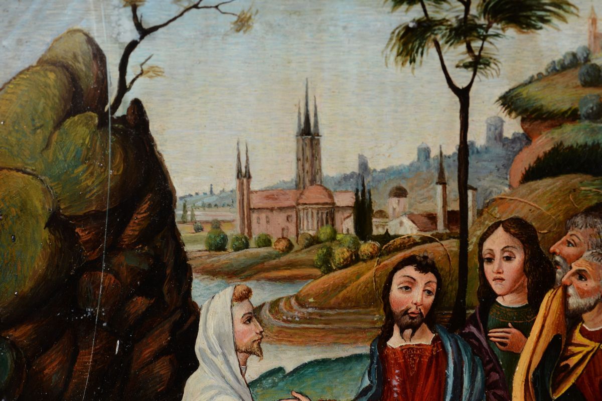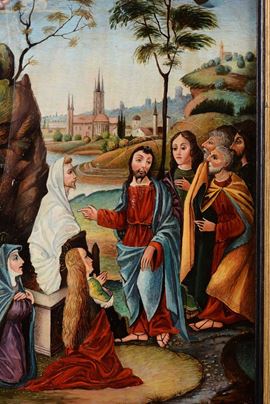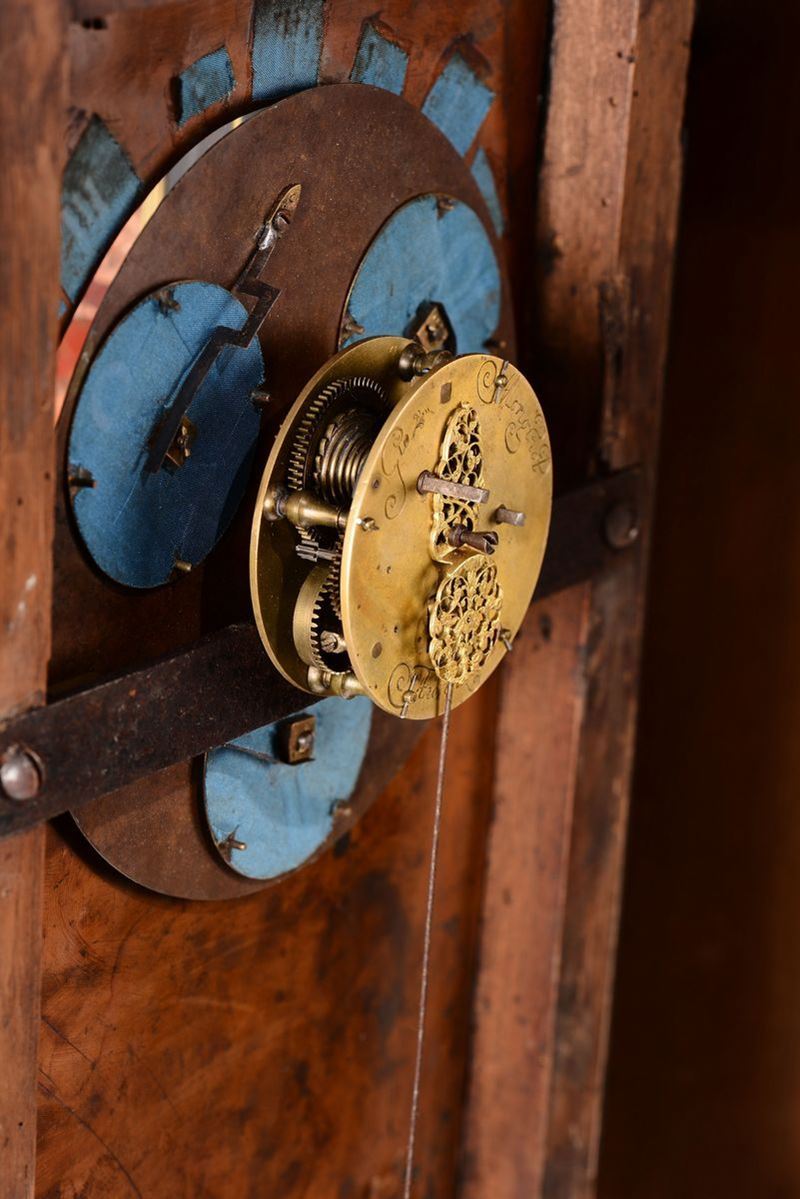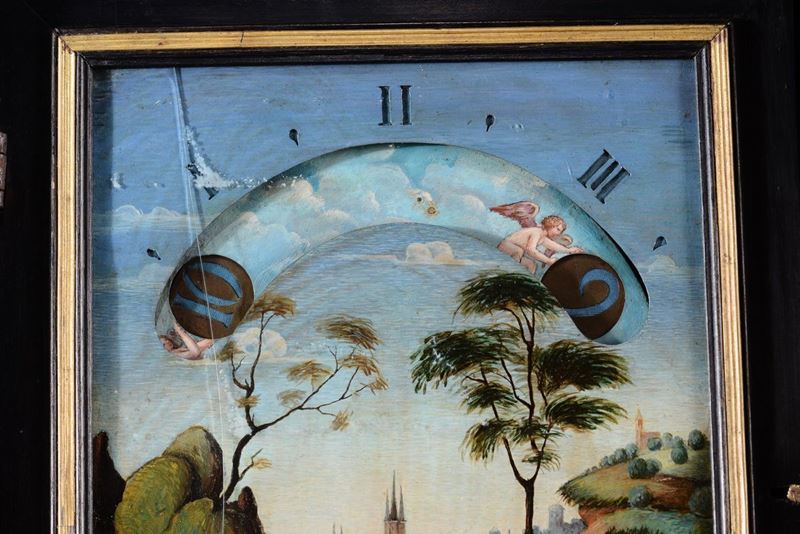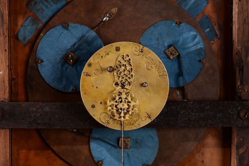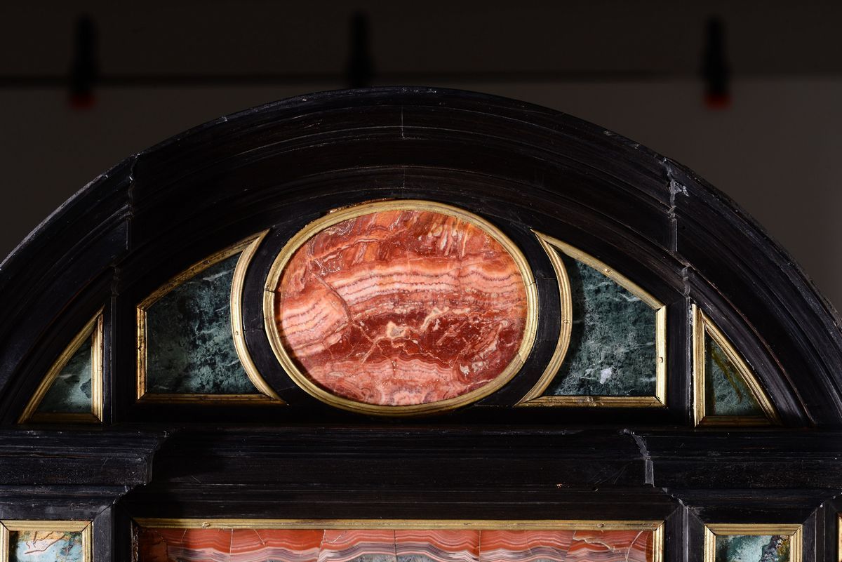 Di foggia architettonica, con scanalature sui fianchi ed un cassetto alla base, decorazioni con pannelli in pietre dure levigate nei toni del rosso e verde entro riserve dorate. Quadrante non coevo dipinto su rame con Cristo e i discepoli entro paesaggio, nella parte superiore un’apertura rivela le ore scandendole per quarti d’ora. Il movimento reca la firma Gio Monginot, Fiorenze; scappamento a verga.cm 71x21x84