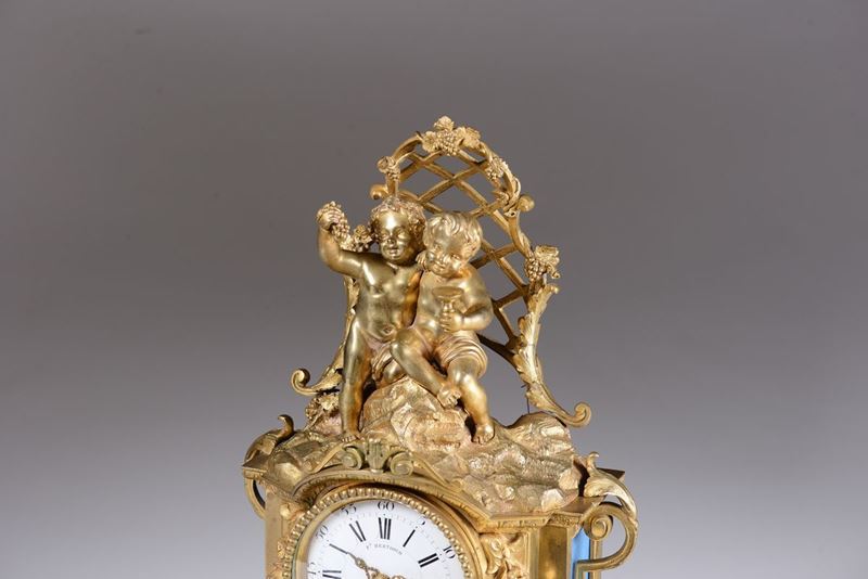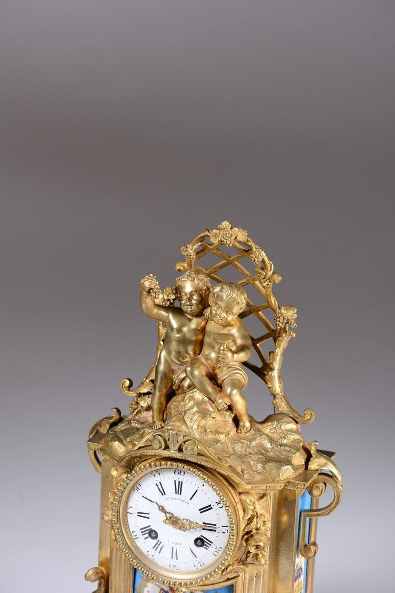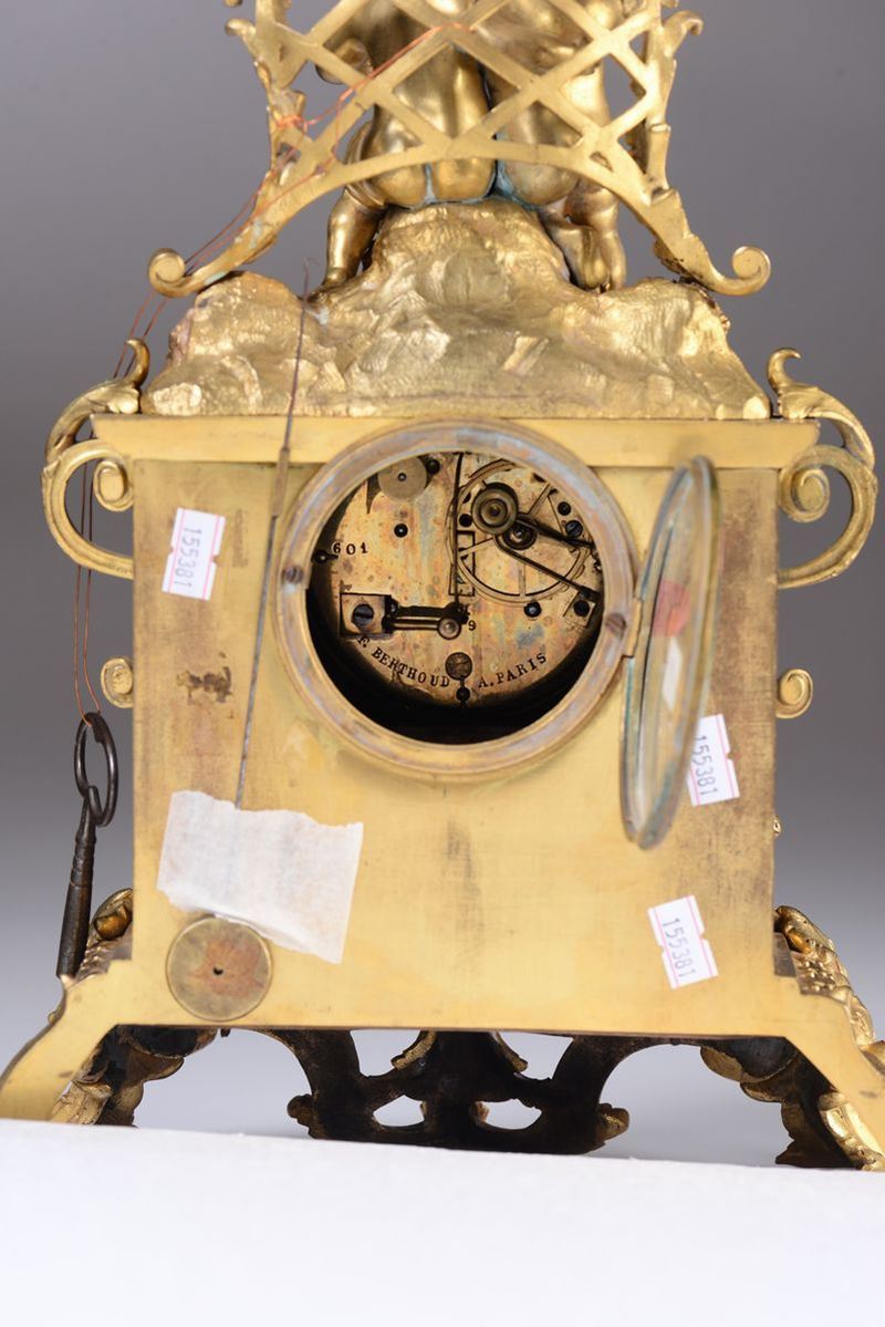 Cassa curvilinea in bronzo dorato con placche in porcellana policroma sormontata da due putti ebbri seduti su base rocciosa. Quadrante in smalto bianco con numerazione romana in nero per le ore e araba per i minuti, firmato F.Berthoud a Paris; medesima firma anche sul movimento. Scappamento ad ancora, suoneria a ore e mezze su campanellocm 28x14x40