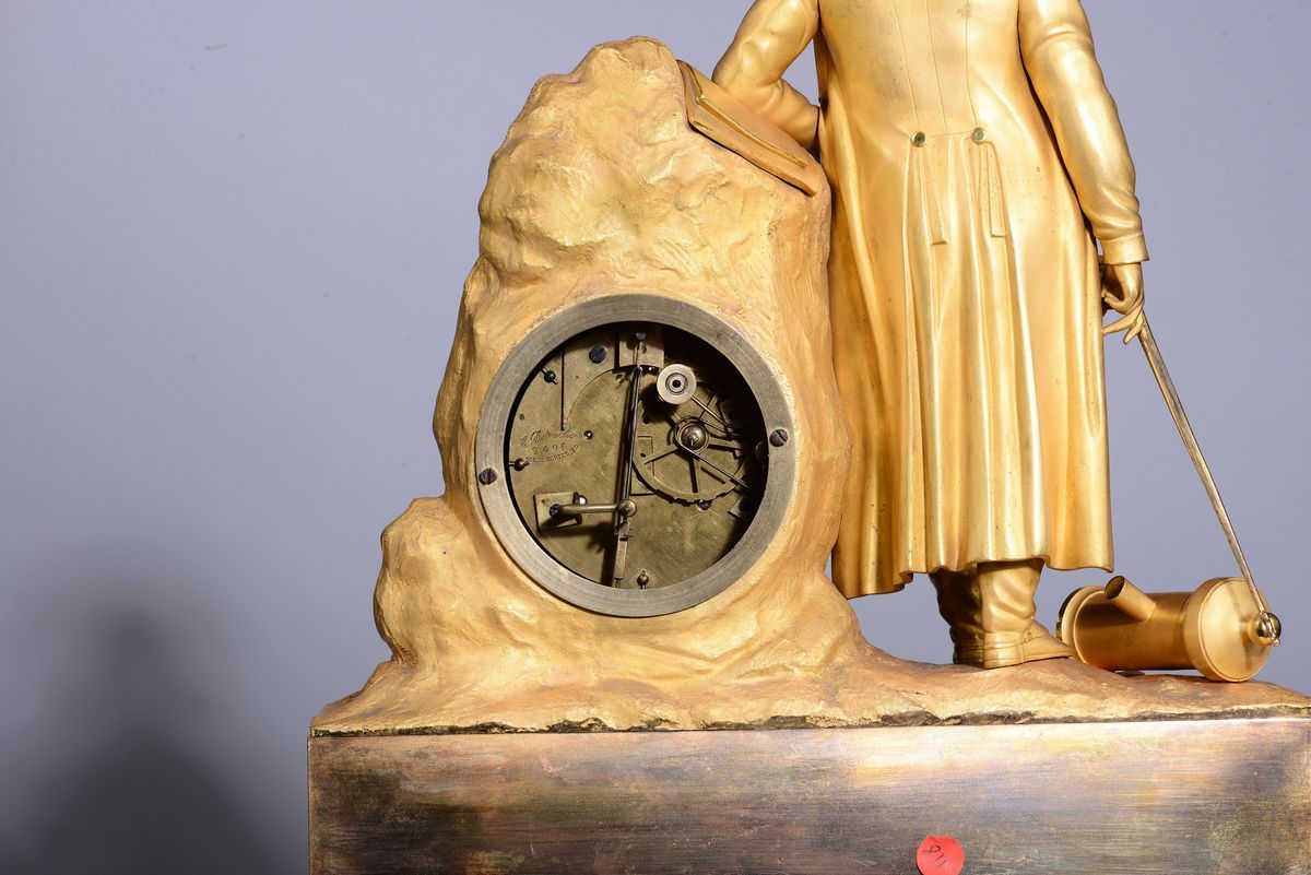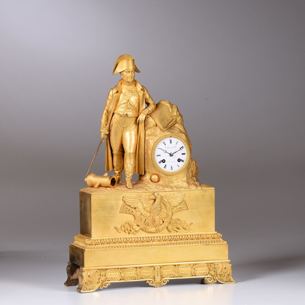 con figura di Napoleone a tuttotondo che si appoggia alla cassa di foggia rocciosa che contiene il quadrante in smalto bianco con numerazione romana in nero, firmato C. Detouche B.te. Scappamento ad ancora, suoneria a ore e mezze su campanello. Nei cartigli in basso sono incise le località delle principali battaglie vinte dall’Imperatore.cm 37x13x55