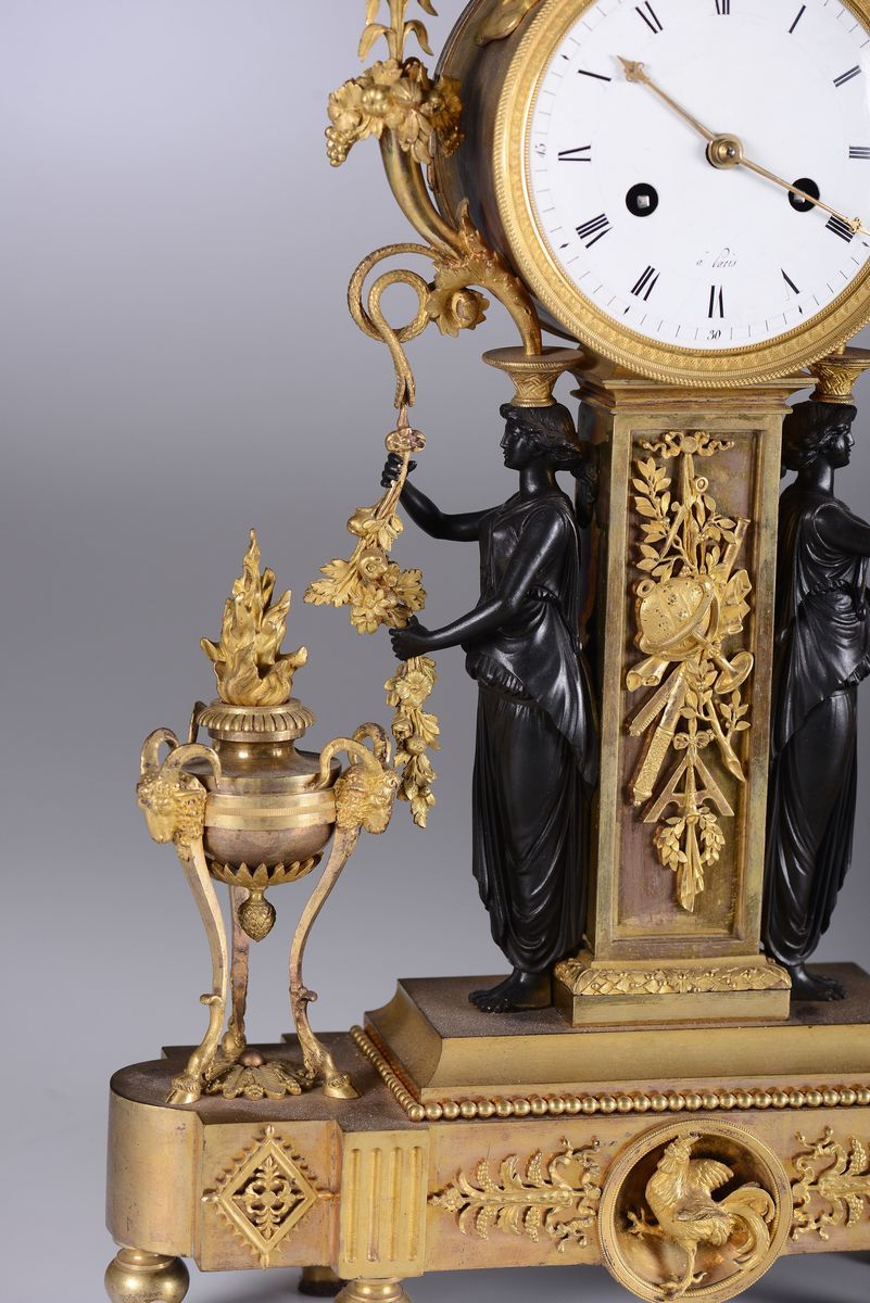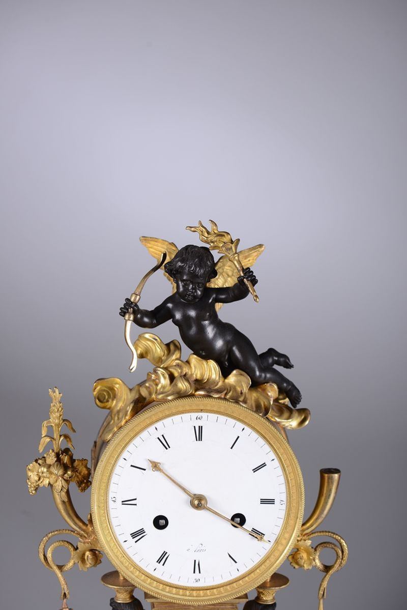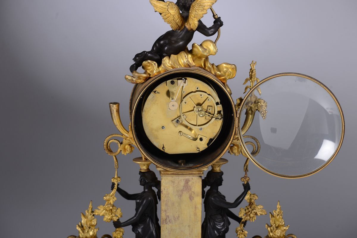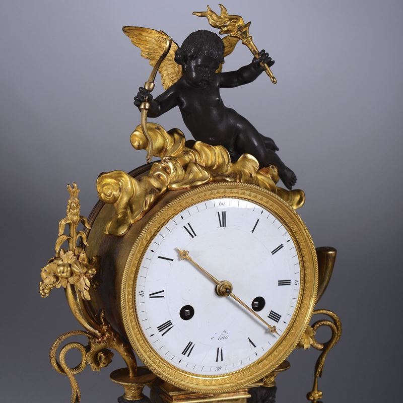Cassa in bronzo dorato con cariatidi e puttino in bronzo brunito. Vasetti tripodi ammati poggianti su base ovale, quadrante in smalto bianco con numerazione romana per le ore in nero. Firma incisa sul retro: Thomire a Paris.Scappamento ad ancora e sospensione a lo con registro a tergo, suoneria con ruota partitora ad ore e mezze al passaggio.cm 37x11x57