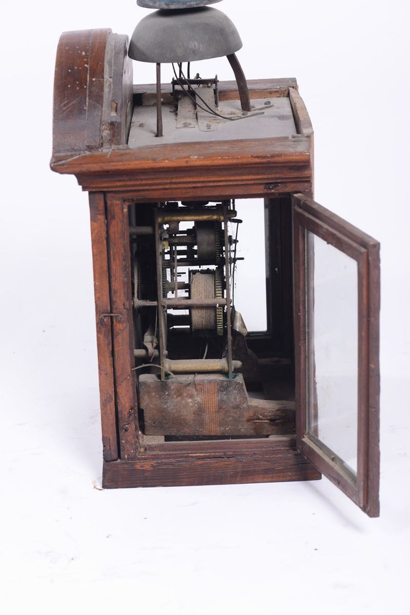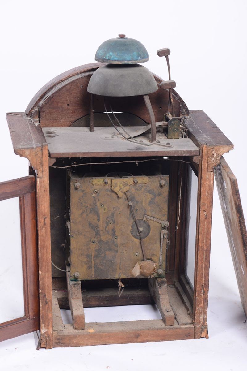 Cassa in noce con cappello centinato. Quadrante in ottone con fascia oraria riportata e al centro quadrantino per la sveglia. Movimento in ottone con scappamento a verga, suoneria a passaggio su campane. cm 36x24x44, colonna altezza cm 210