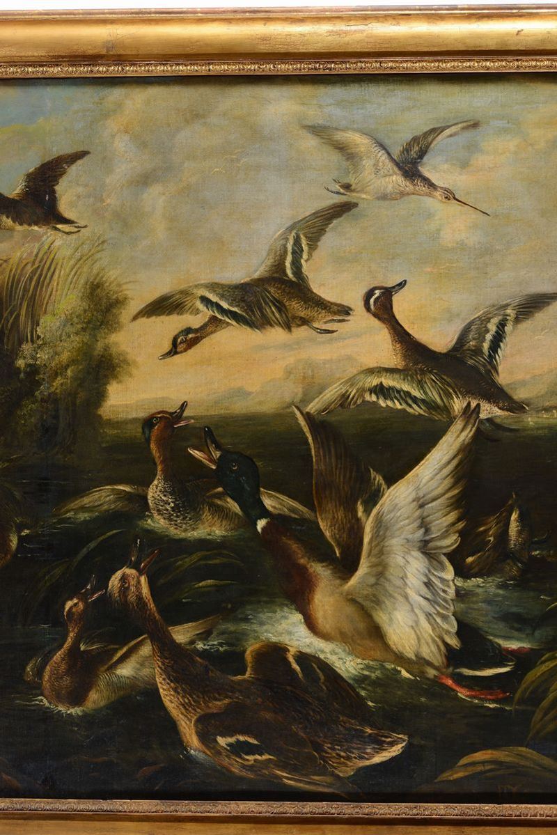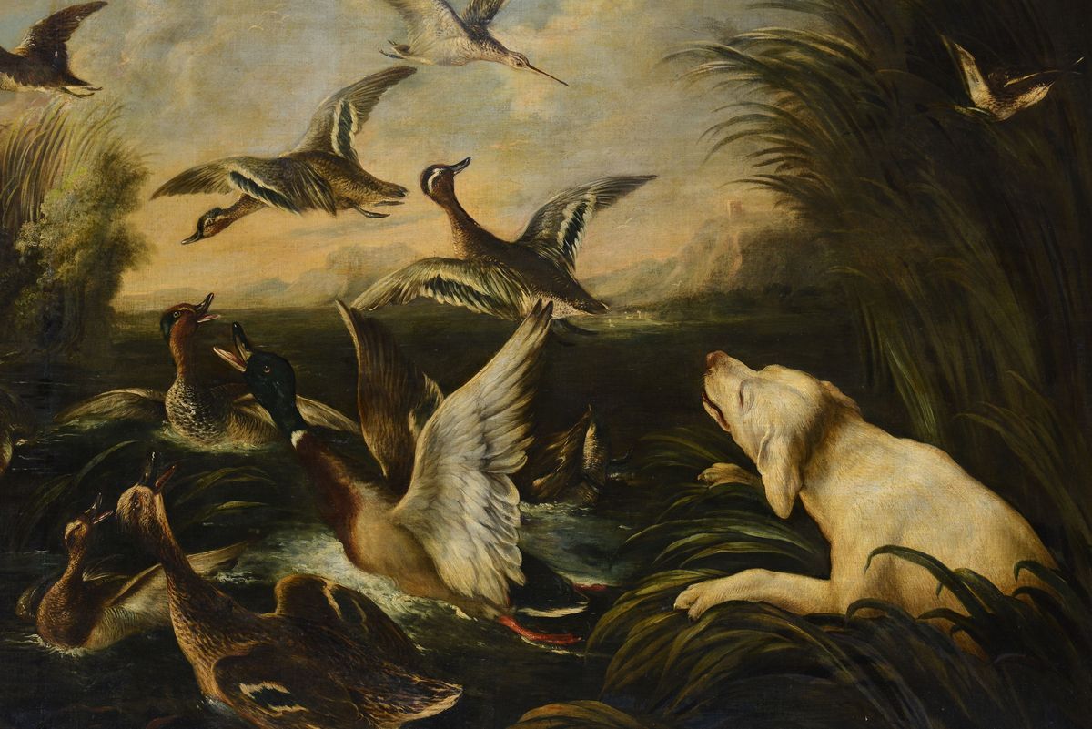 Scena di caccia con cane e volatili
