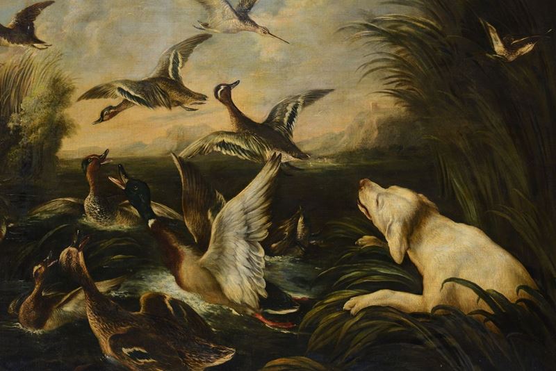 Baldassarre De Caro (Napoli 1689-1750) Scena di caccia con cane e volatili