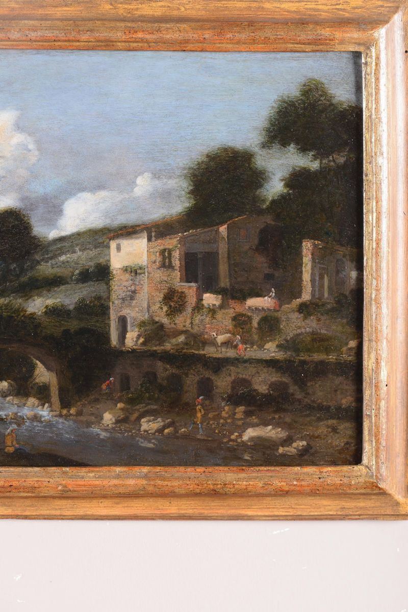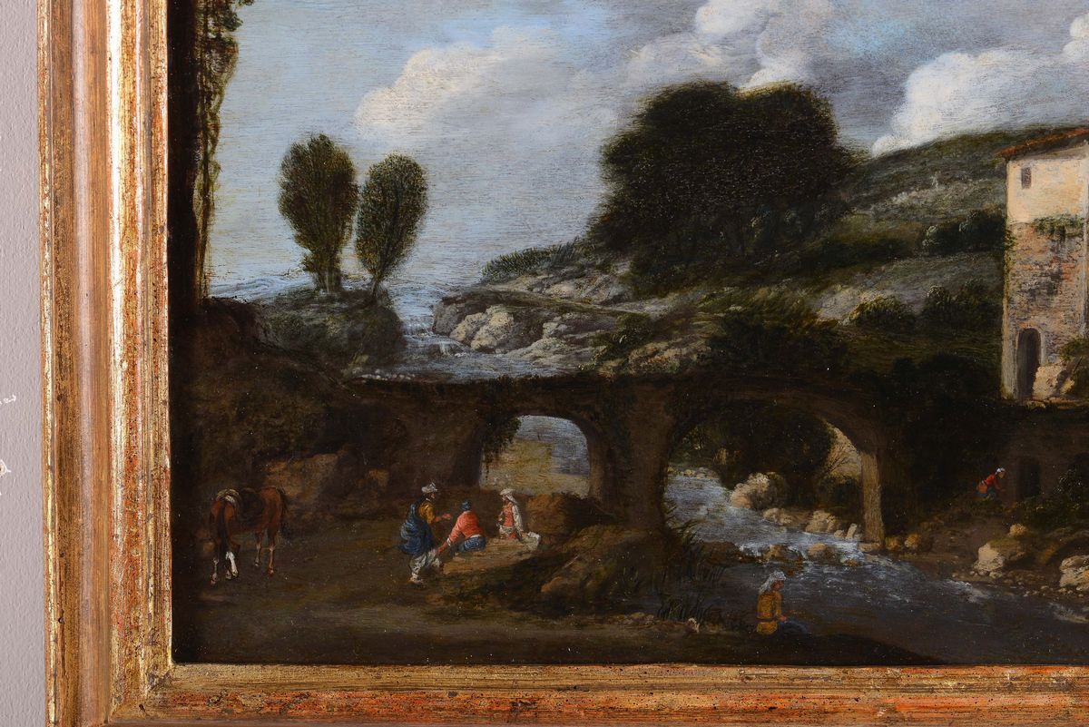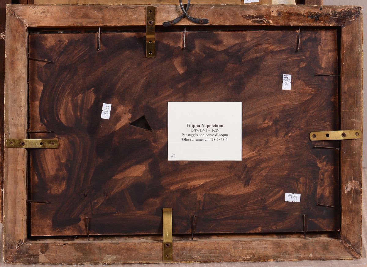 Expertise di Mina Gregori. Questo incantevole e denso paesaggio racchiude tutte le qualità di Filippo Napoletano, che fu il primo italiano a seguire le nuove indicazioni naturalistiche di Goffredo Wals, conosciuto a Napoli, di Adam Elsheimer e del Saraceni. Il segnale più significativo del suo nuovo naturalismo in quest'opera è nel cielo con le nuvole che salgono dall'orizzonte. Anche nella natura descritta con molta attenzione si colgono le grandi novità che furono elaborate nel primo seicento: nel corso d'acqua nel quale si rispecchiano i muri, nella presenza delle figurette sulle rive in vari atteggiamenti, negli alberi che sono visti nelle loro masse ombrose. Filippo Napoletano ha svolto per alcuni anni la ssua attività di paesista, e non solo, alla corte di Toscana, protetto dal granduca Cosimo II, appassionato collezionista delle novità della pittura di paesaggio. Con la morte del suo protettore Filippo Napoletano si spostò a Roma, dove creò un mueso di ispirazione naturalistica e fu frequentato e apprezzato dai primi Lincei. Mina Gregori, 6 giugno 2007