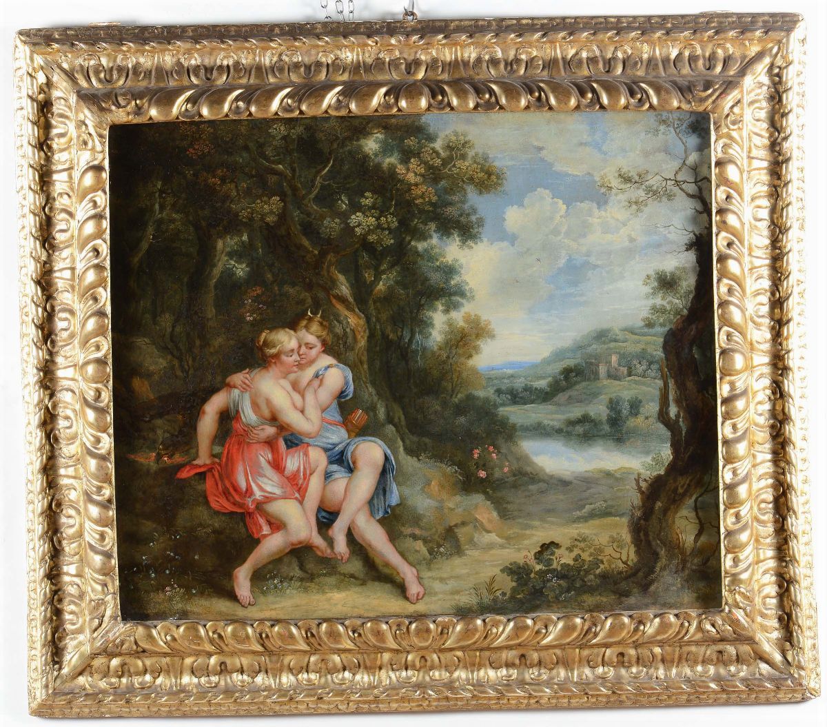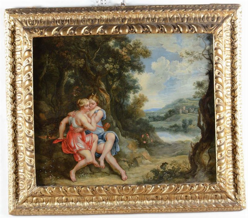 Scuola del nord Europa del XVIII secolo Paesaggio con figura femminile