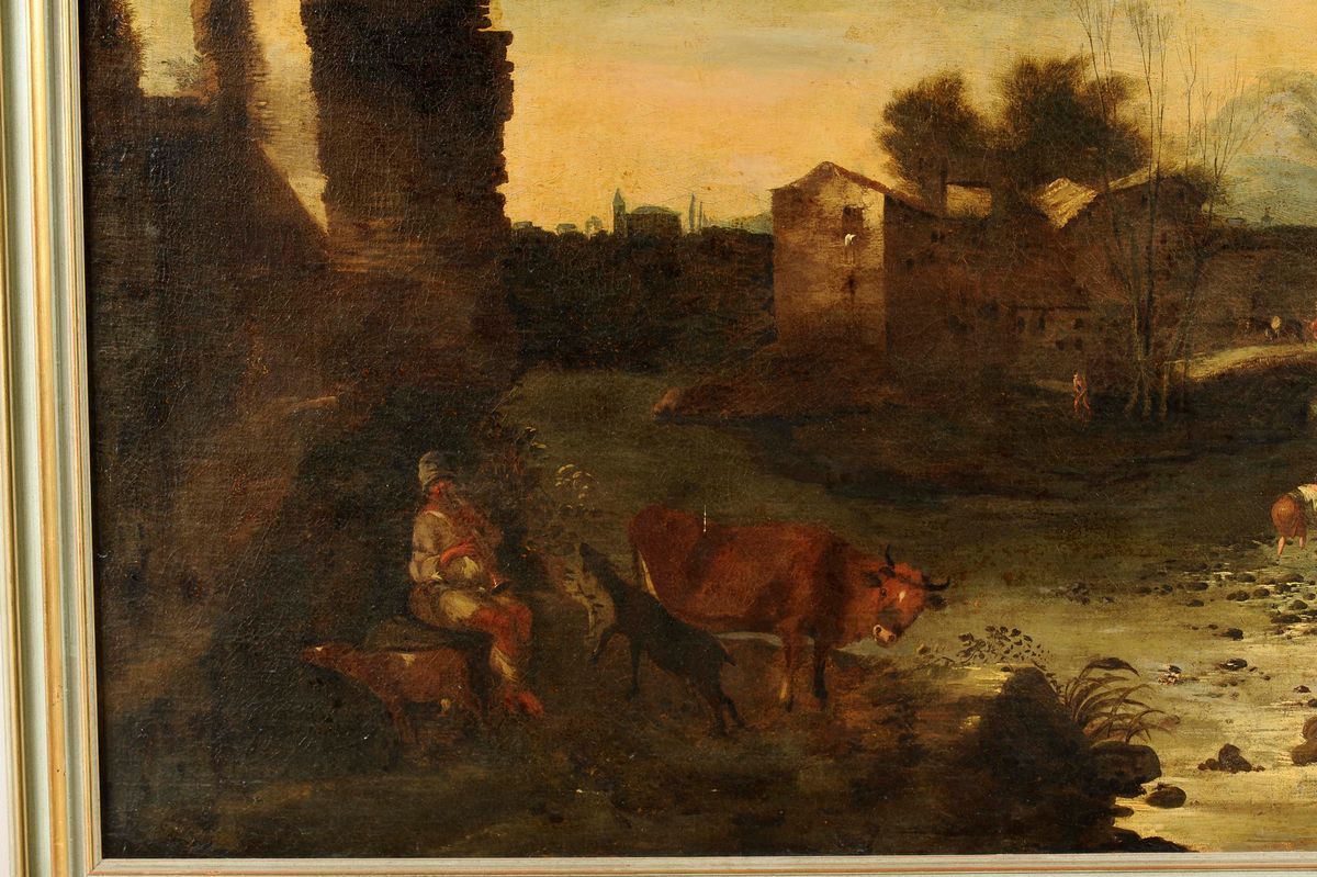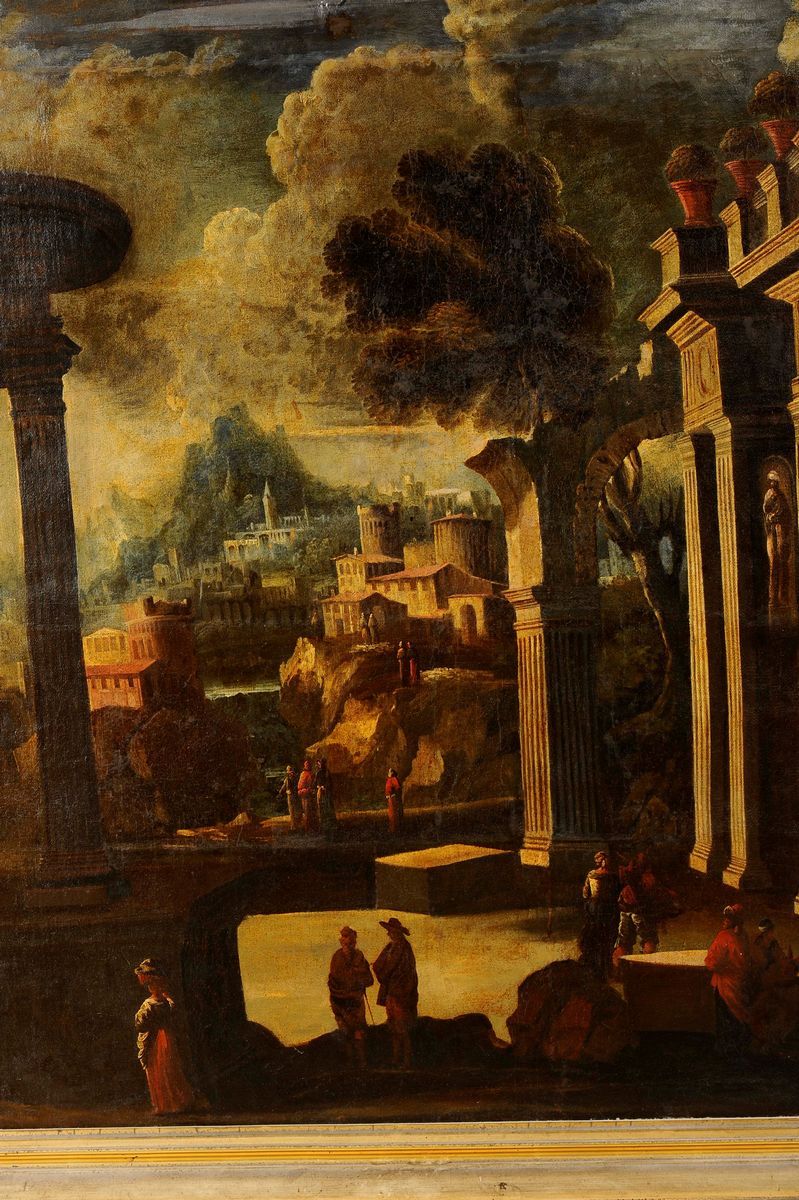 Scuola del XVII secolo Architettura con paesaggio, figure e città sullo sfondo