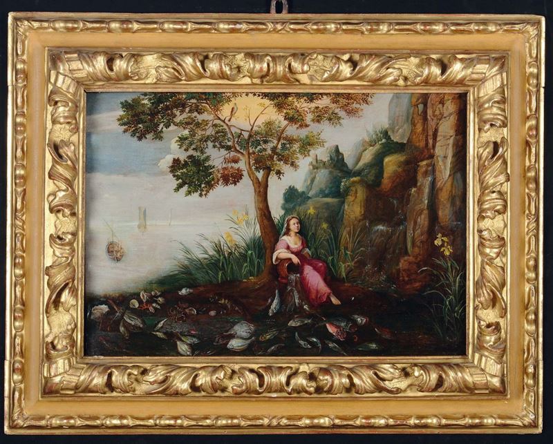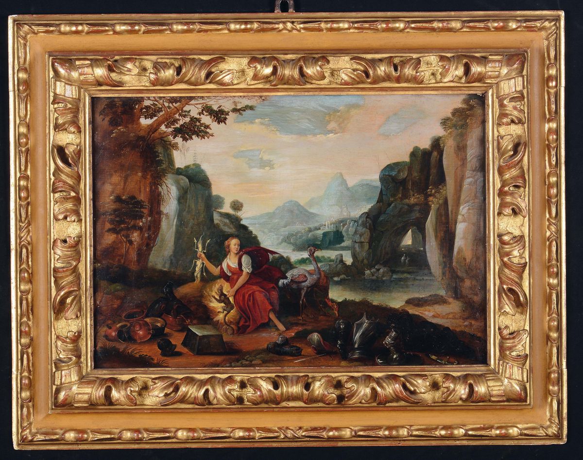 tre dipinti ad olio su tavola, cm 36x52, in cornice dorata