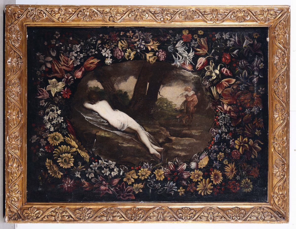 Scuola italiana del XVII secolo Nudo femminile in paesaggio entro corona di fiori