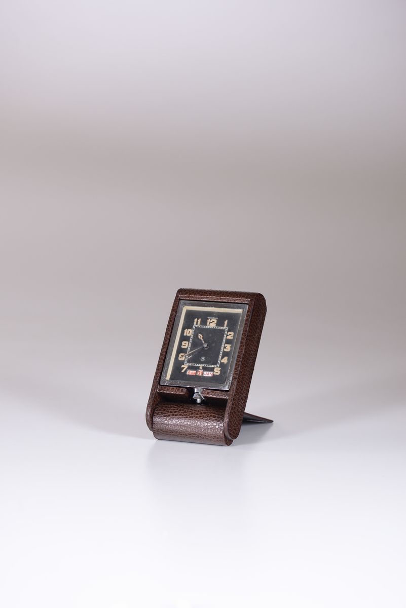 JAEGER-LeCOULTRE, Desk Clock with Calendar, Patent No. 365.884, fine and rare, chrome and crocodile 8-day desk clock with [..]