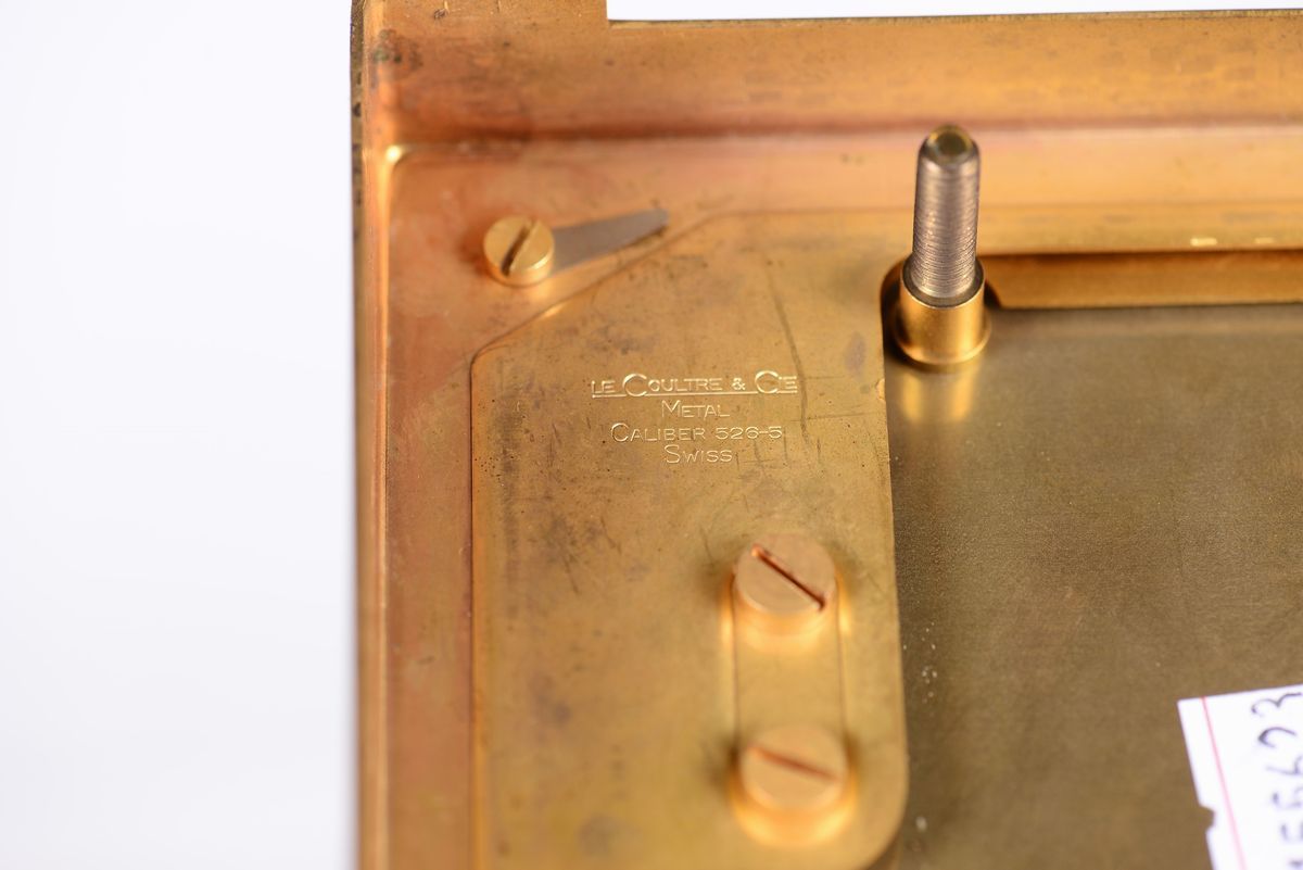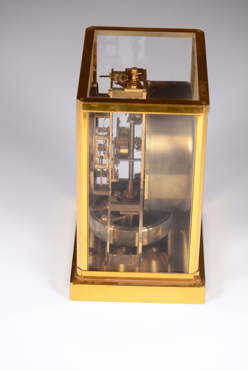 LECOULTRE ATMOS, fine, rectangular, gilt brass and glass clock wound by barometric pressure changes. Made circa 1970