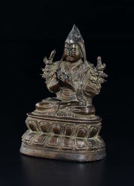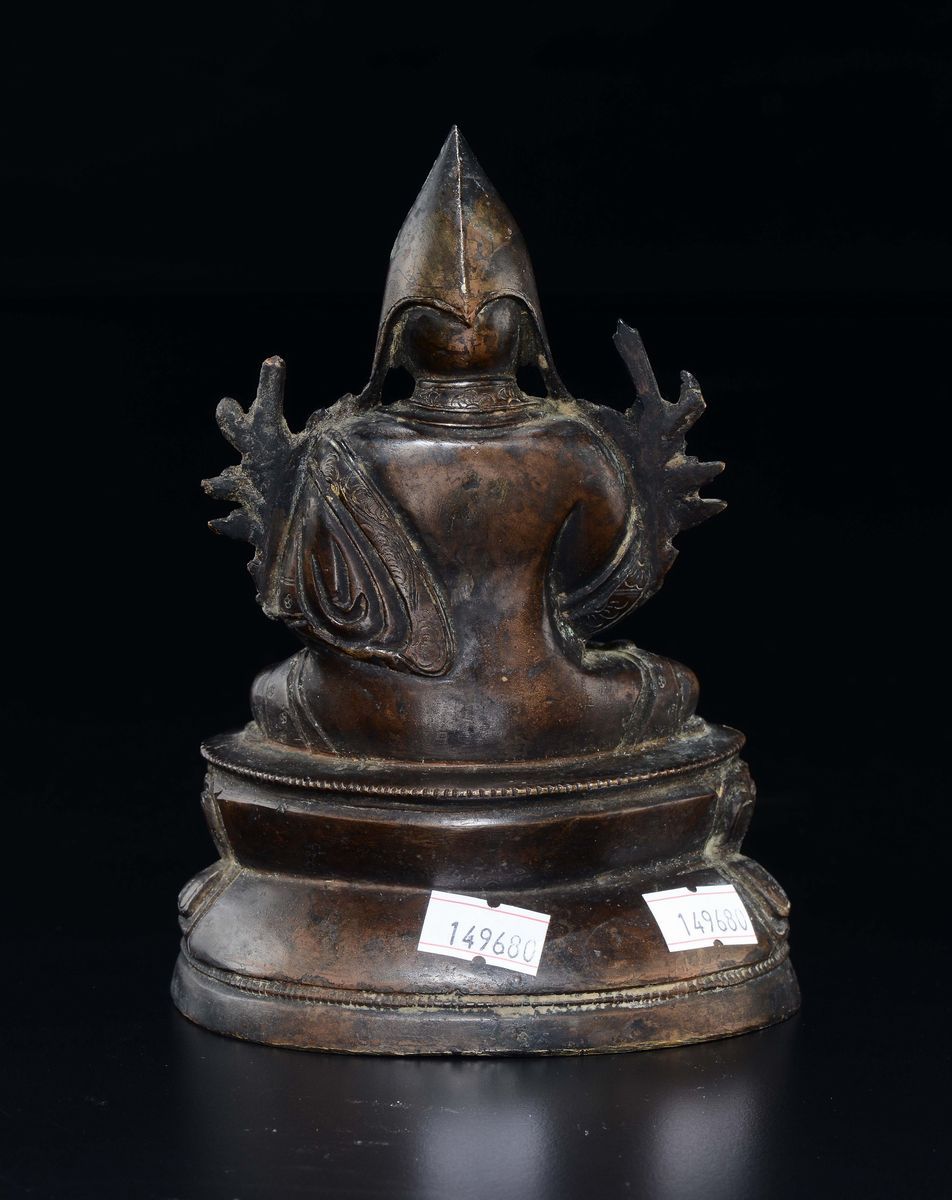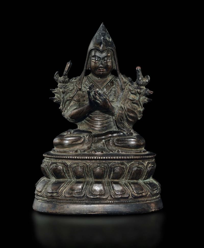 A bronze figure of Tsong khapa on a double lotus flower, Tibet, 18th century